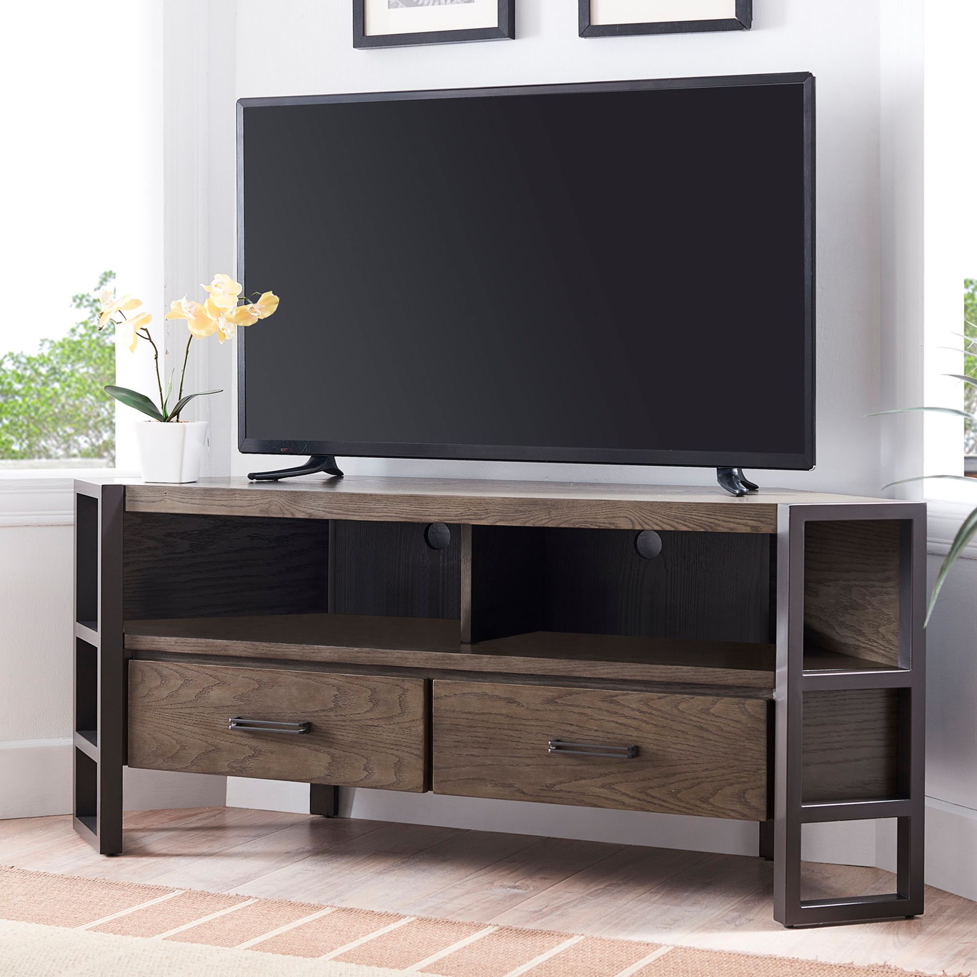 Ender 58 1/2"W Smoke Gray Gunmetal 3-Drawer Corner TV Stand