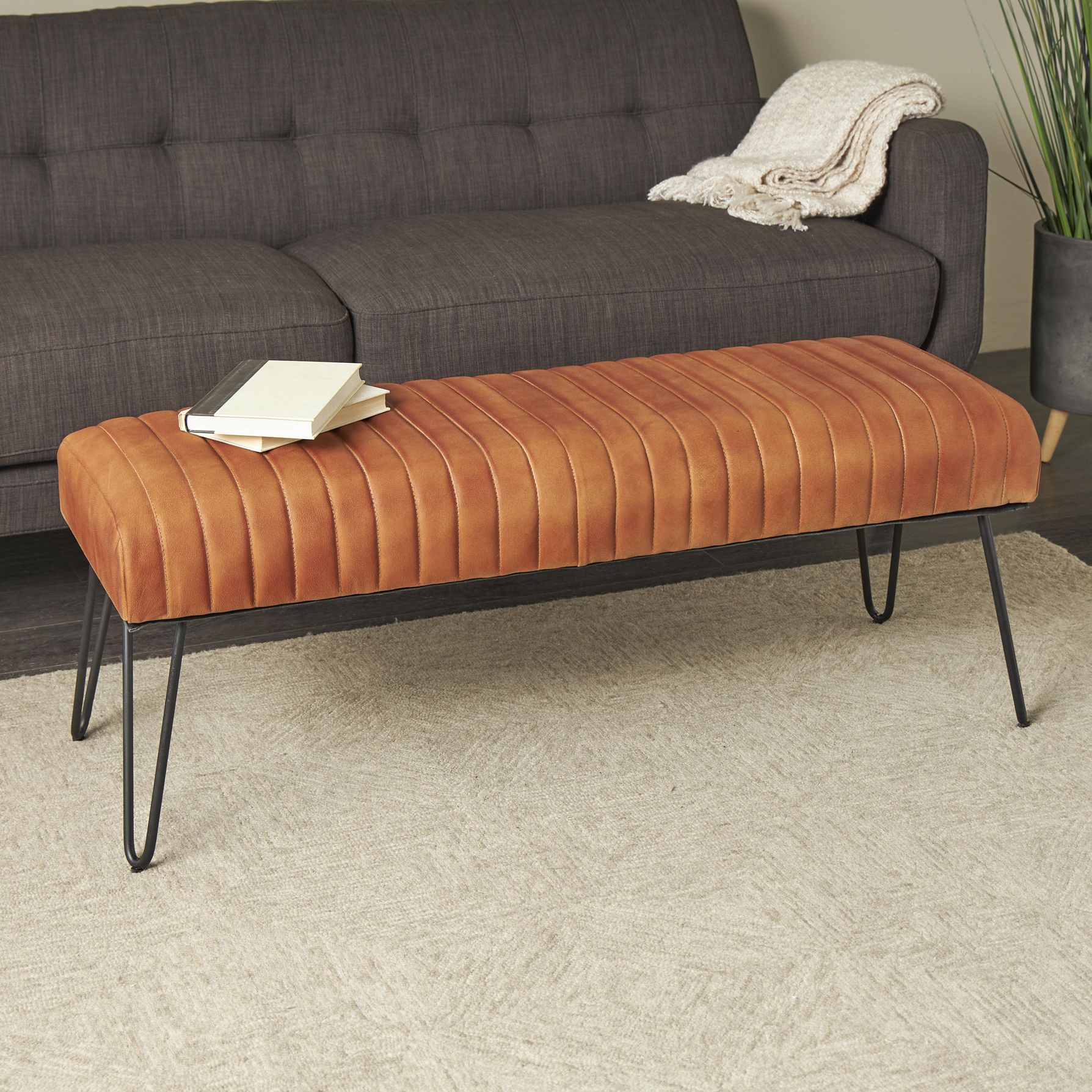 Brown Leather Modern Farmhouse Bench, 47" x 17" x 18"