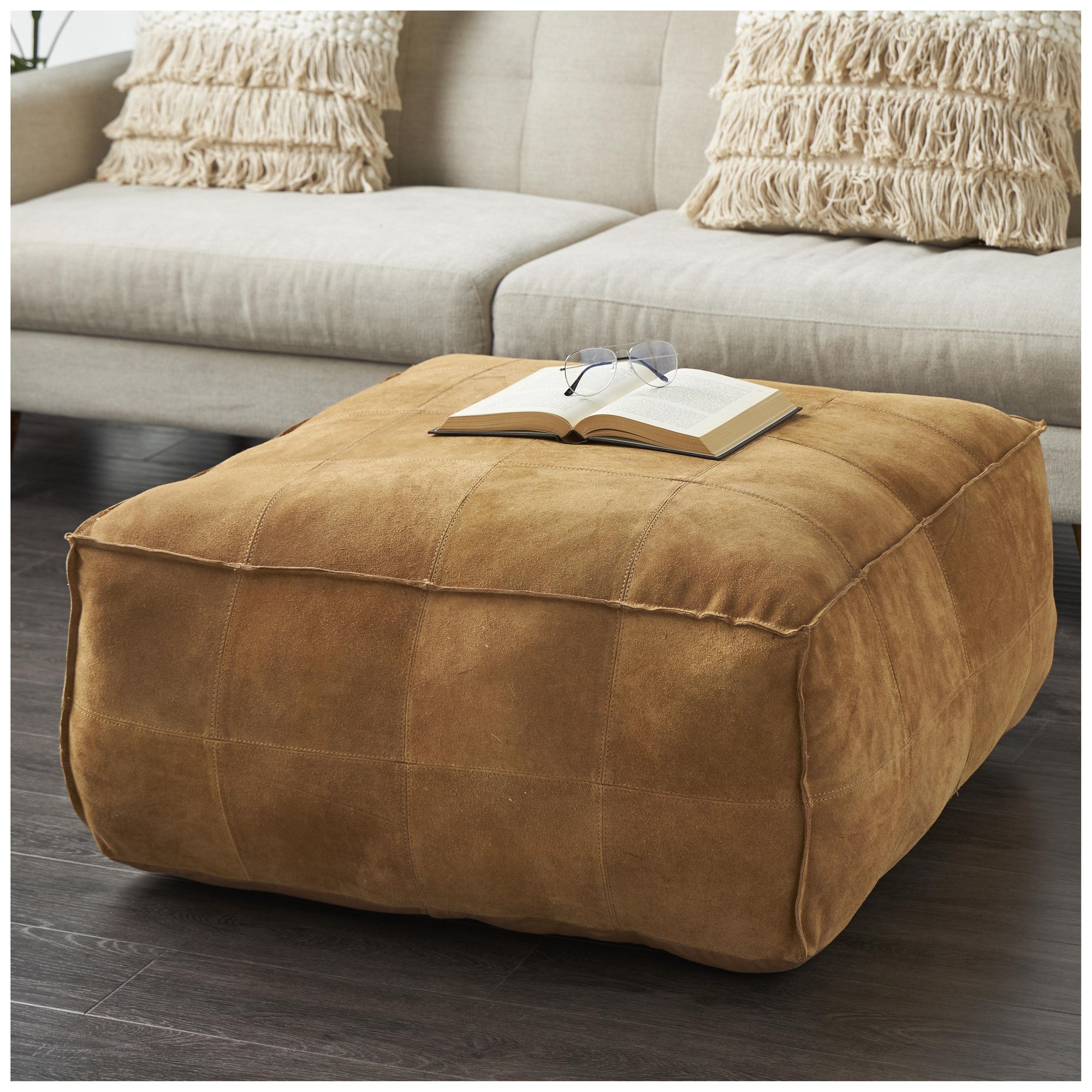 Brown Leather Rustic Pouf, 35" x 35" x 19"