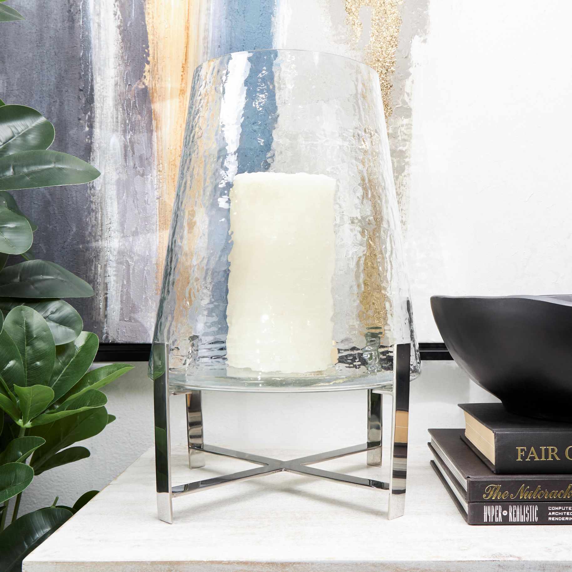 Clear Stainless Steel Metal Contemporary Hurricane Lamp, 10" x 10" x 16"