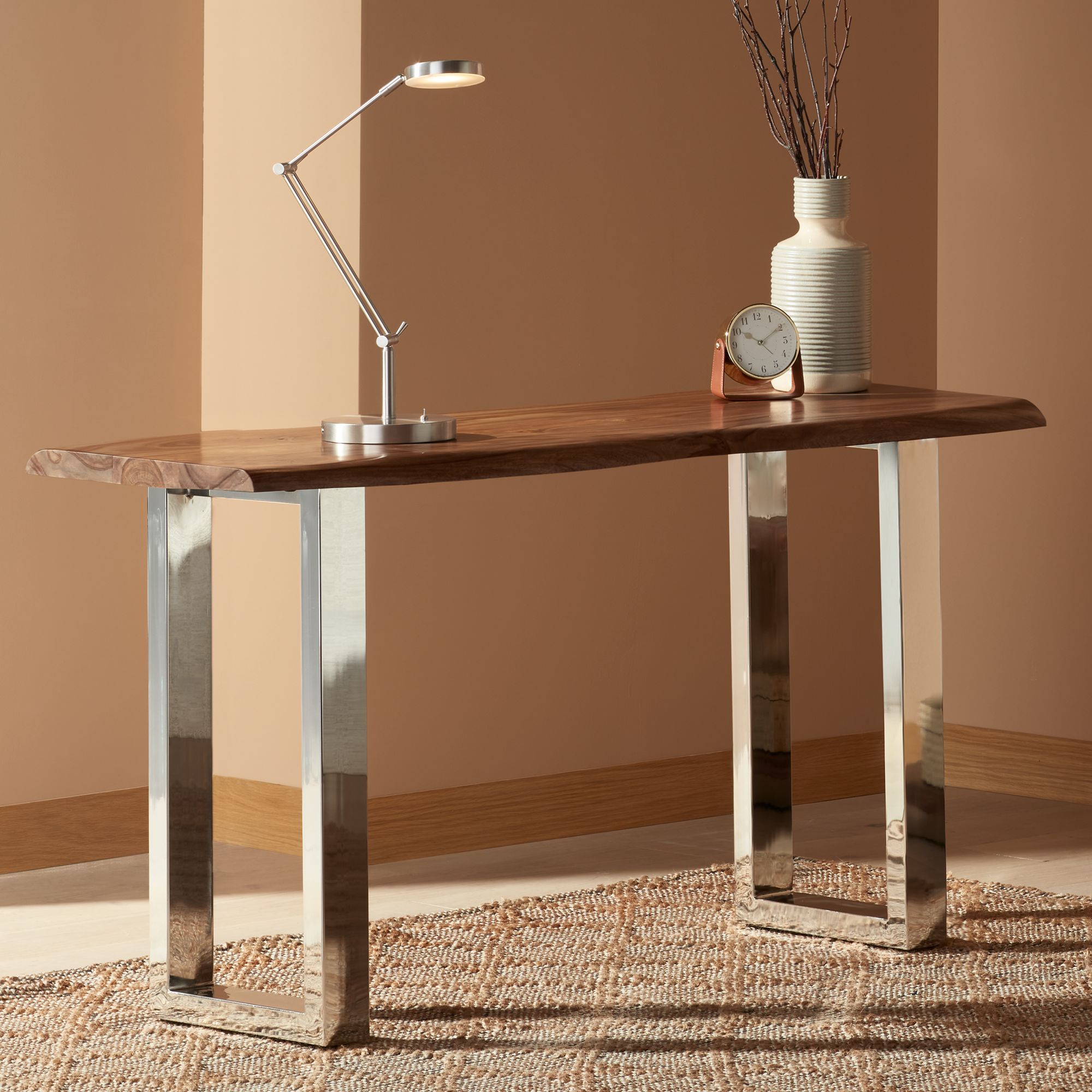 Raw Edge Brownstone 58" Wide Chrome and Wood Console Table