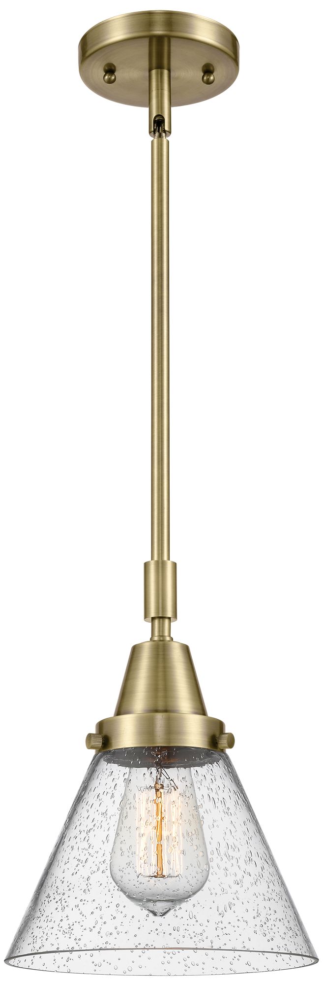 Caden Cone 8" Wide Antique Brass Stem Hung Mini Pendant w/ Seedy Shade