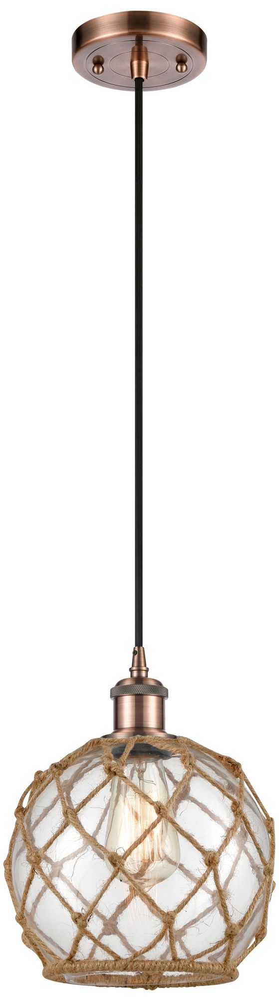 Farmhouse 8"W Cord Hung Copper Mini Pendant w/ Clear and Brown Shade