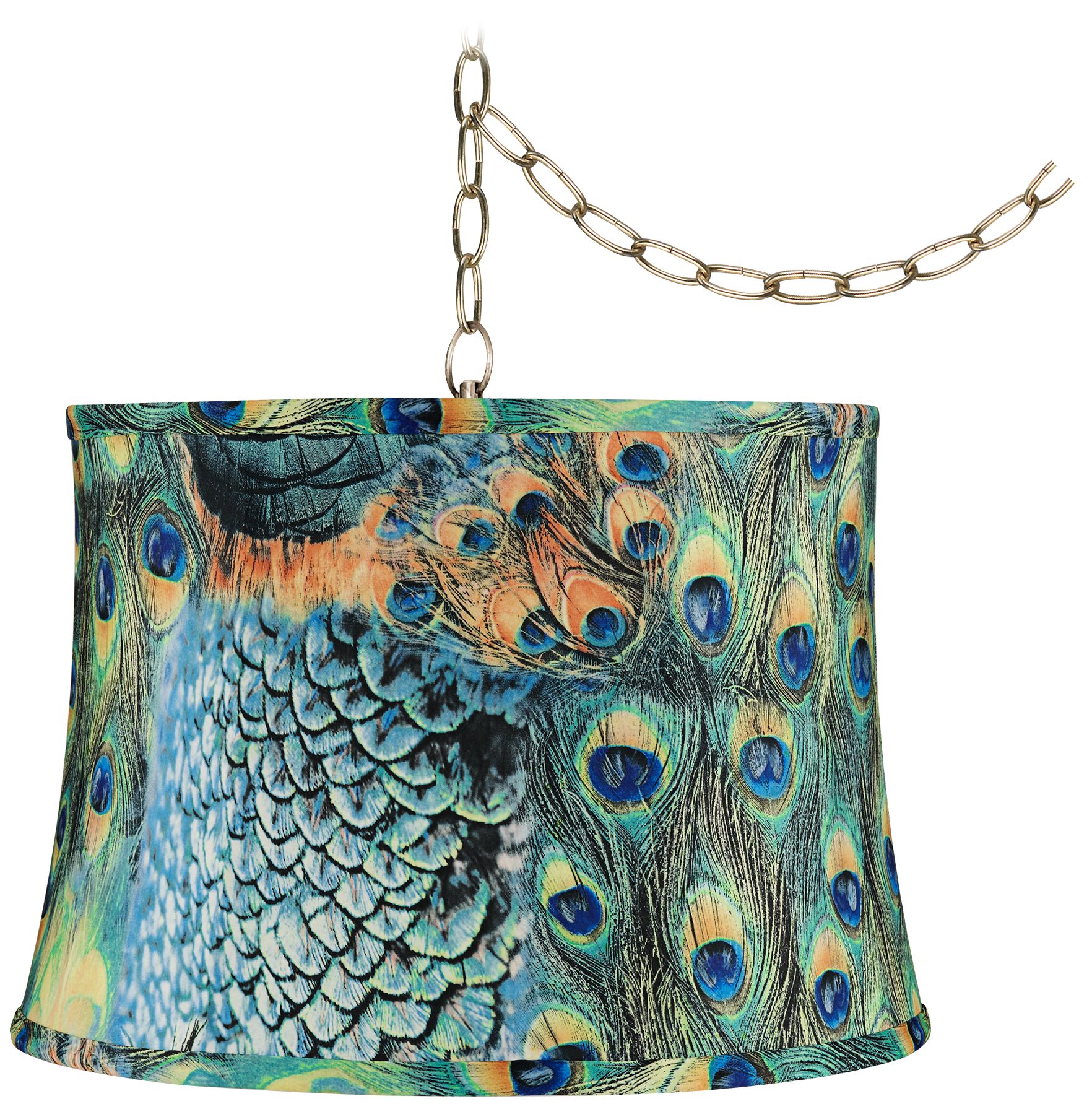 Peacock Print 16" Wide Antique Brass Plug-In Swag Chandelier