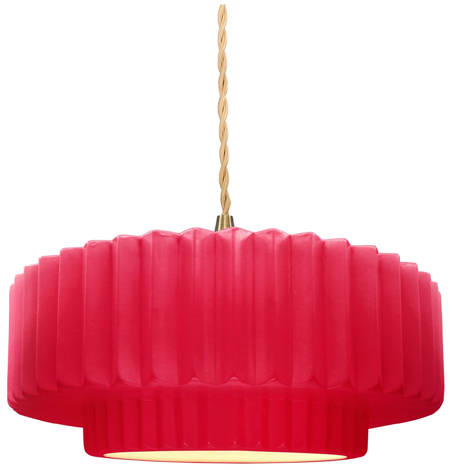 14.5"W Cerise Frame Brushed Brass Tier Pleated Beige Twisted LED Penda