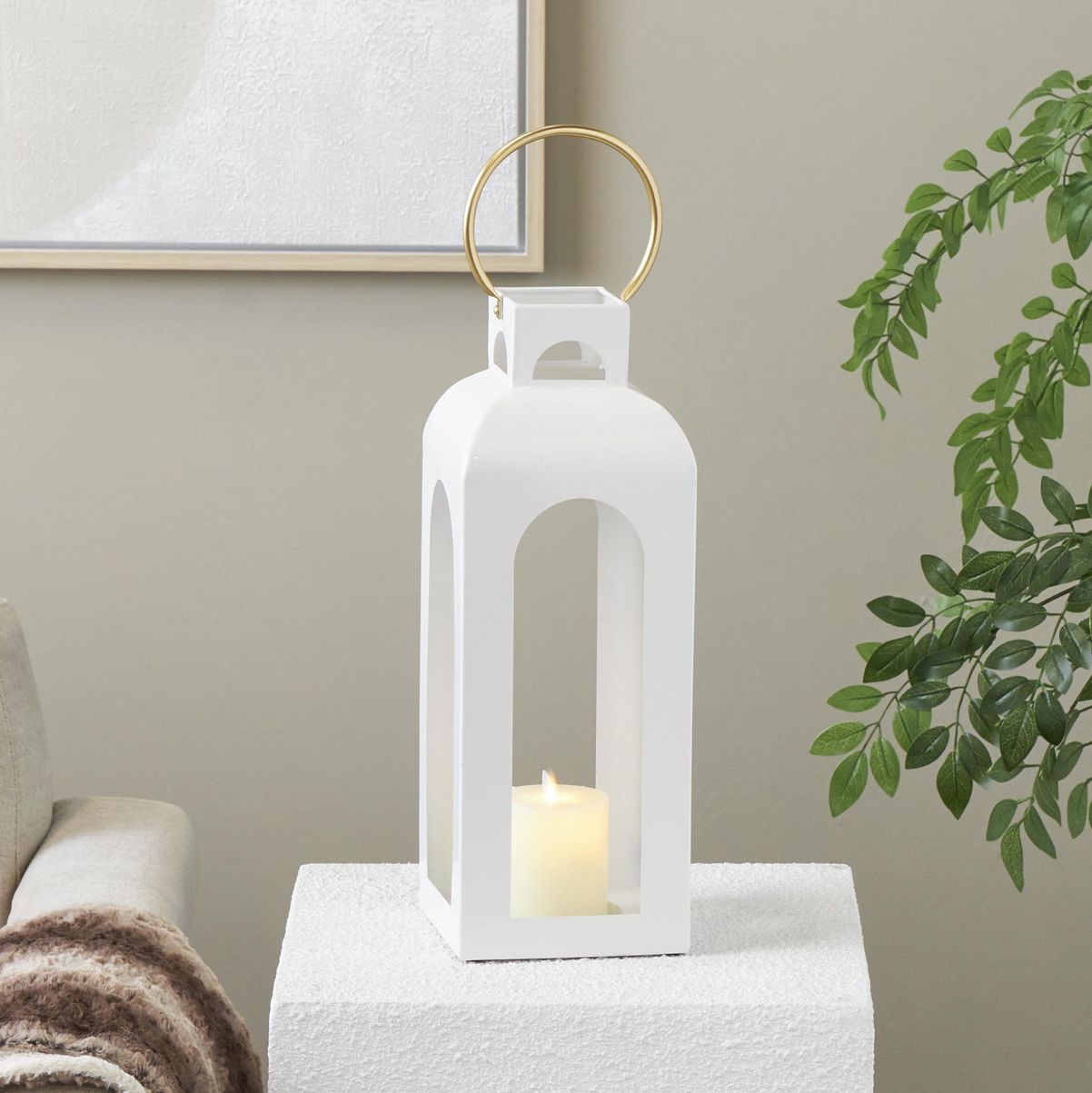 White Metal Transitional Candle Lantern, 7" x 7" x 23"