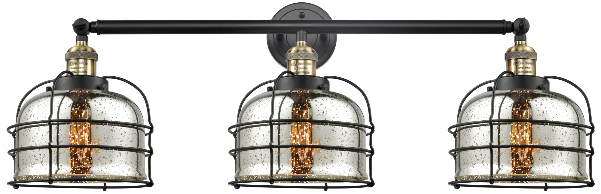 Franklin Bell Cage 34"W 3 Light Black Brass Bath Light w/ Mercury Shad