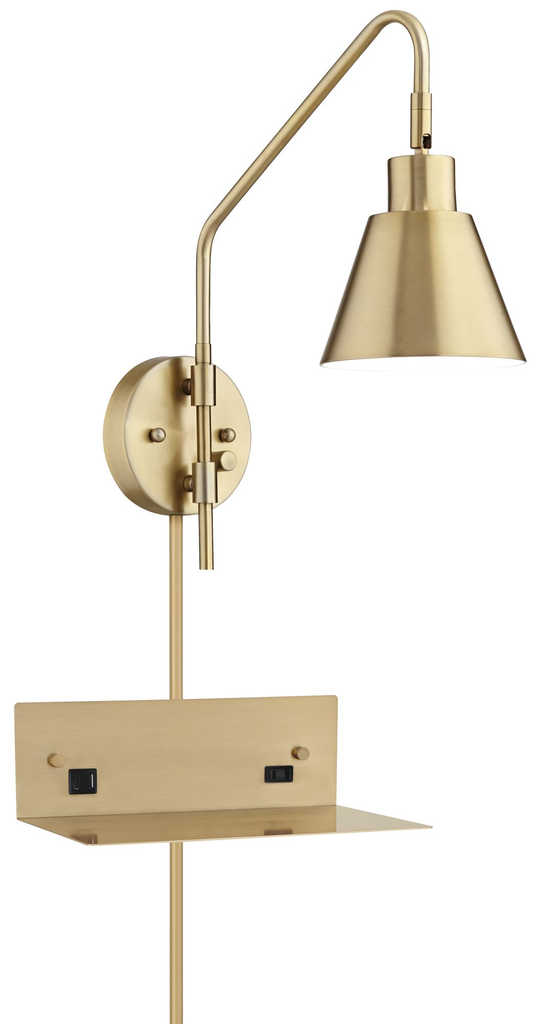 Marybel Brass Adjustable Swing Arm Plug-In Wall Lamp with USB-Outlet Shelf