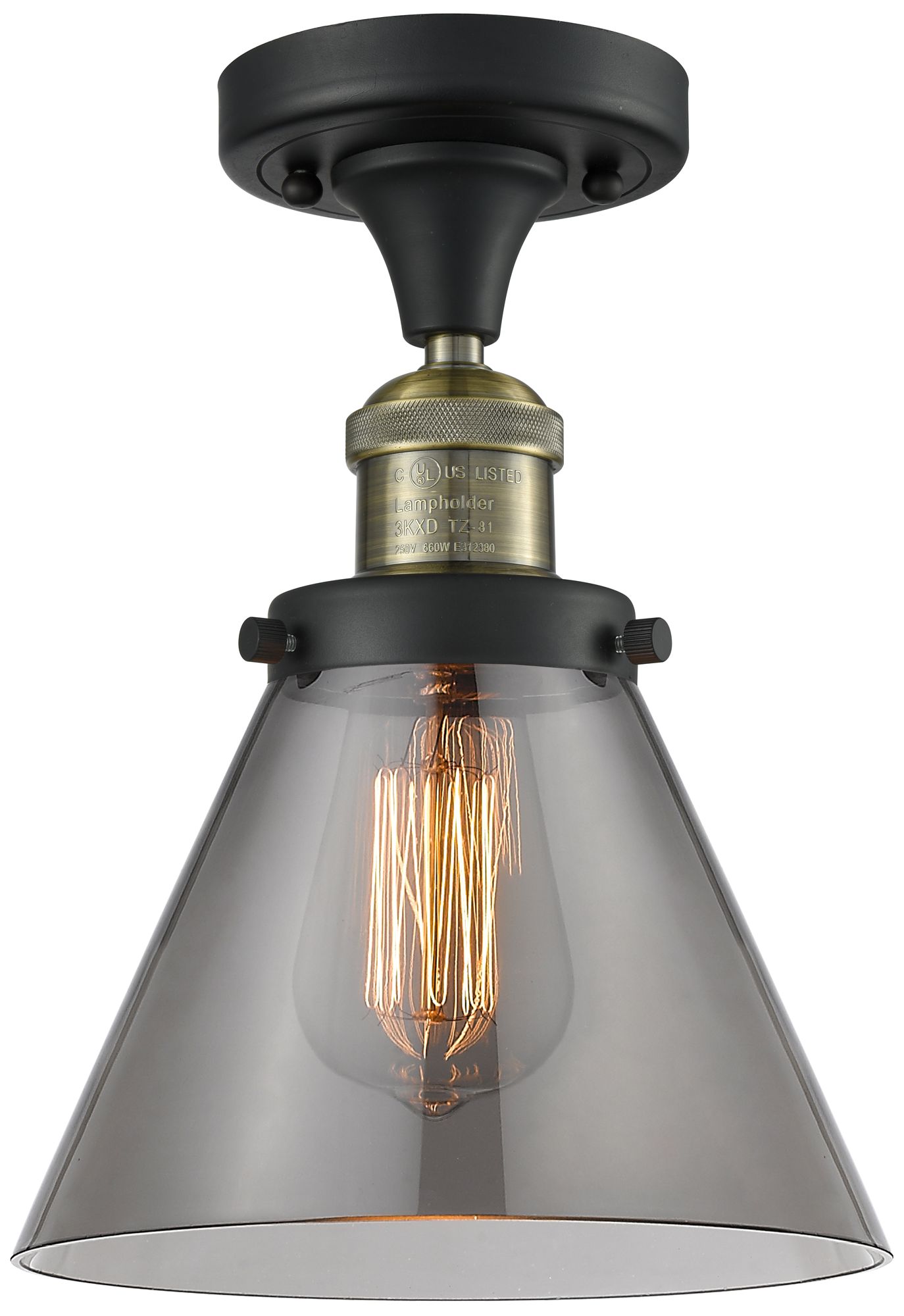 Cone 7.75" Wide Black Brass Semi Flush Mount w/ Plated Smoke Shade