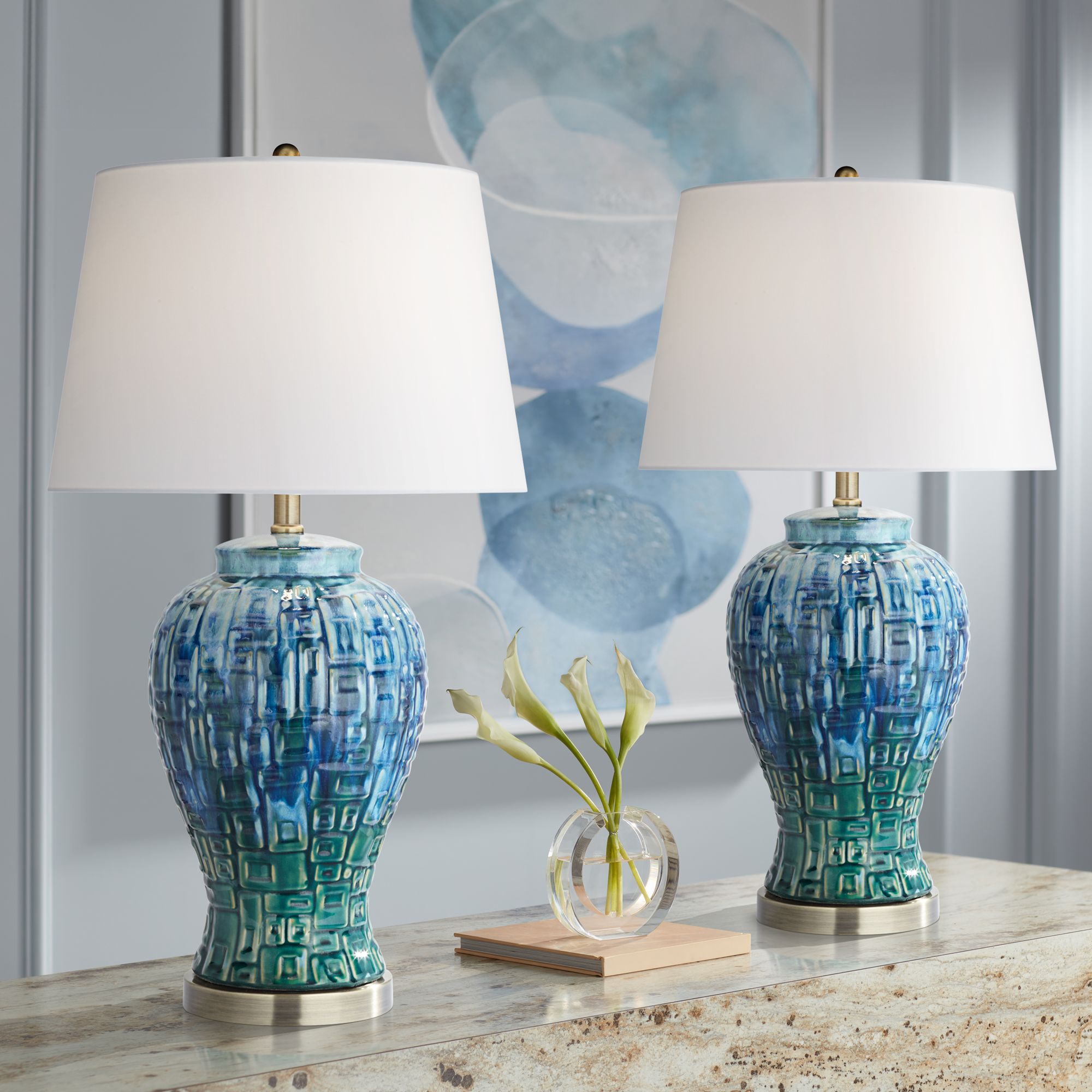 Possini Euro Matsu 27" Teal Temple Jar Ceramic Table Lamp Set of 2
