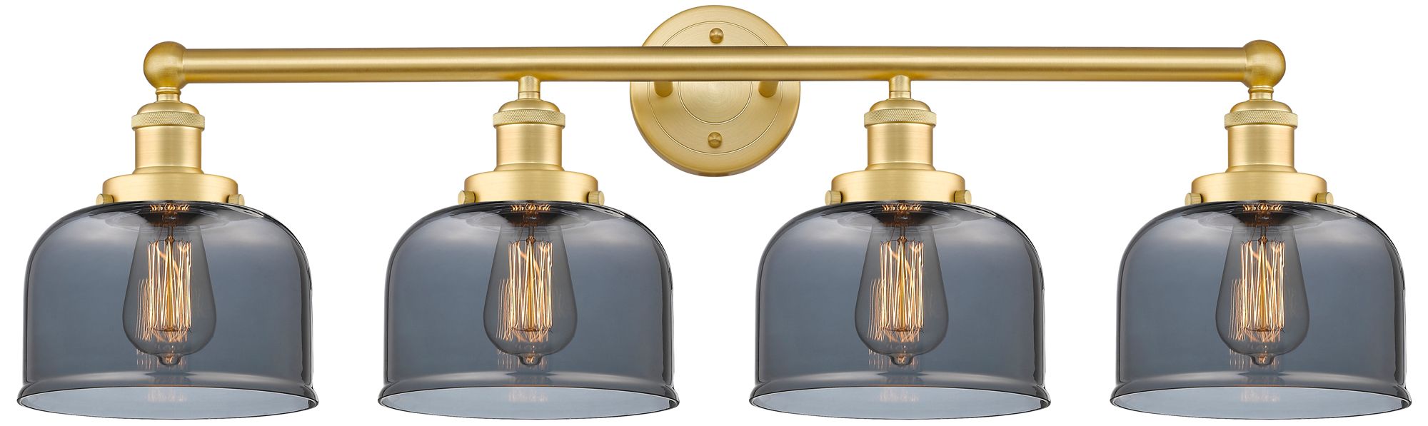 Large Bell 33.5"W 4 Light Satin Gold Bath Light With Plated Smoke Shad