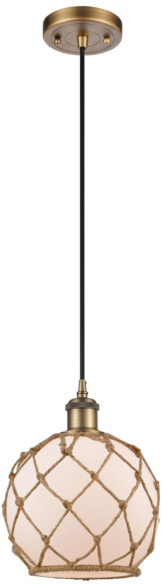 Farmhouse 8"W Cord Hung Brushed Brass Mini Pendant w/ White and Brown