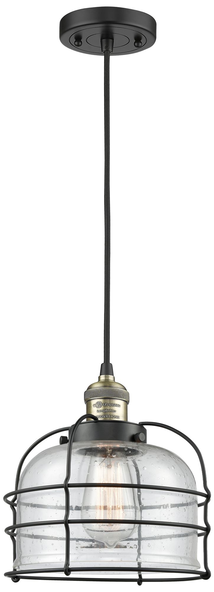 Franklin Bell Cage 9" Black Brass Corded Mini Pendant w/ Seedy Shade