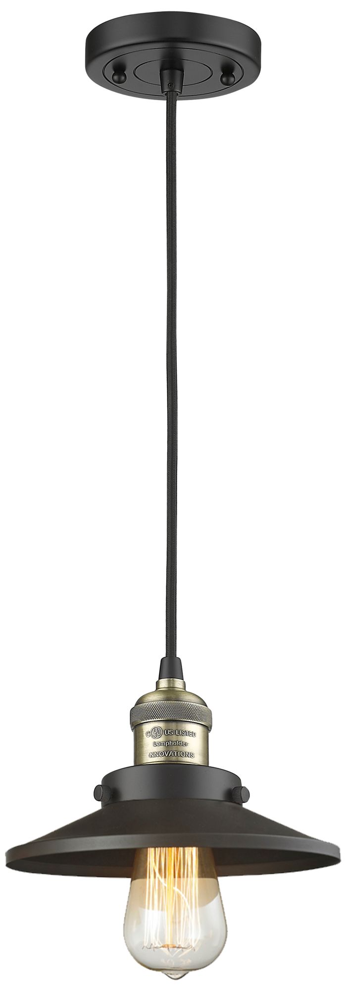 Railroad 8" Black Antique Brass Cord Hung Mini Pendant w/ Matte Black