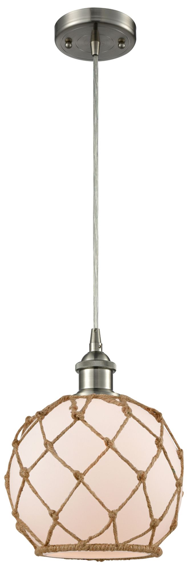 Farmhouse 8"W Cord Hung Satin Nickel Mini Pendant w/ White and Brown S