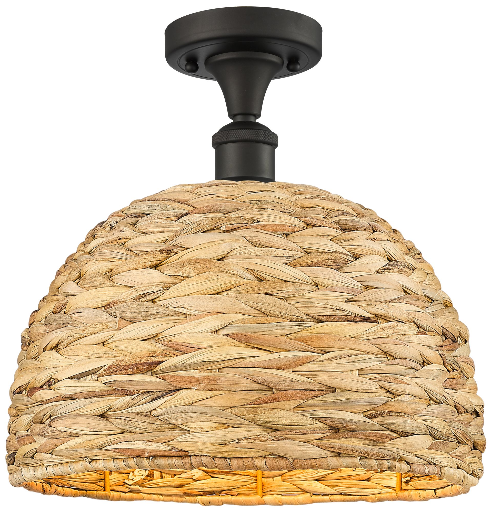 Woven Ratan 12" Wide Oiled Brass Semi-Flush Mount With Natural Rattan