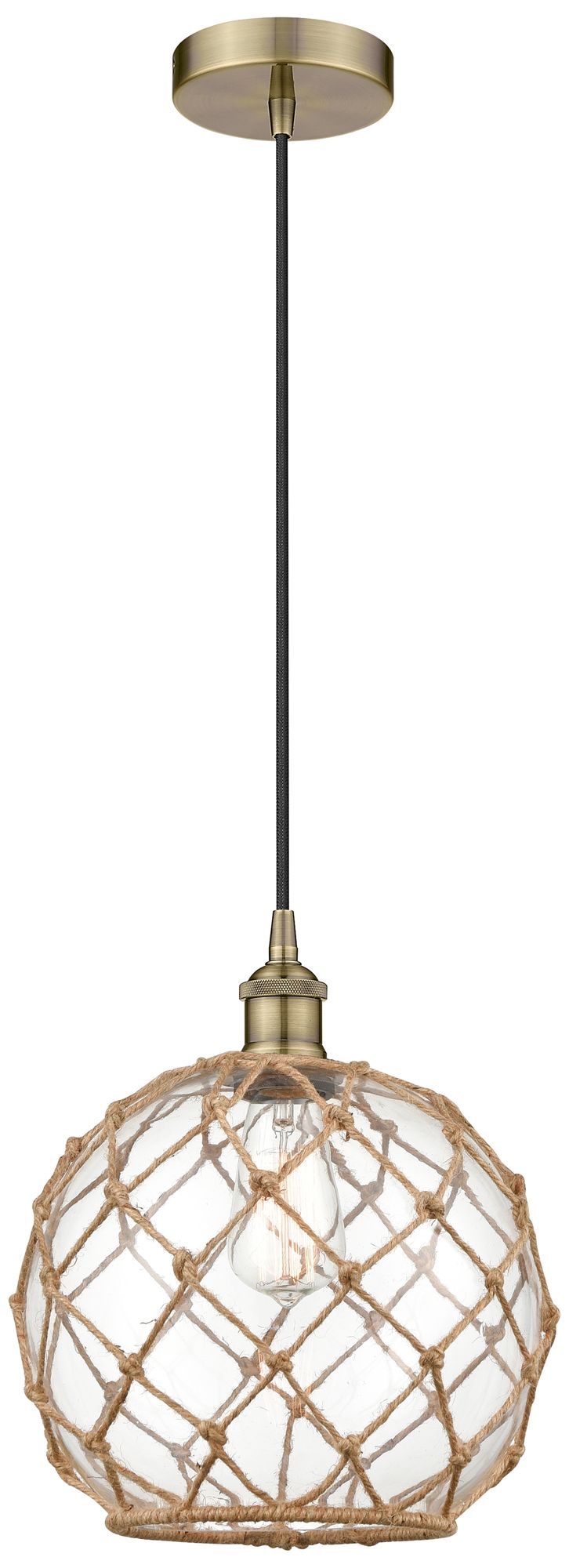 Farmhouse 10" Antique Brass Mini Pendant w/ Clear & Brown Rope Sha