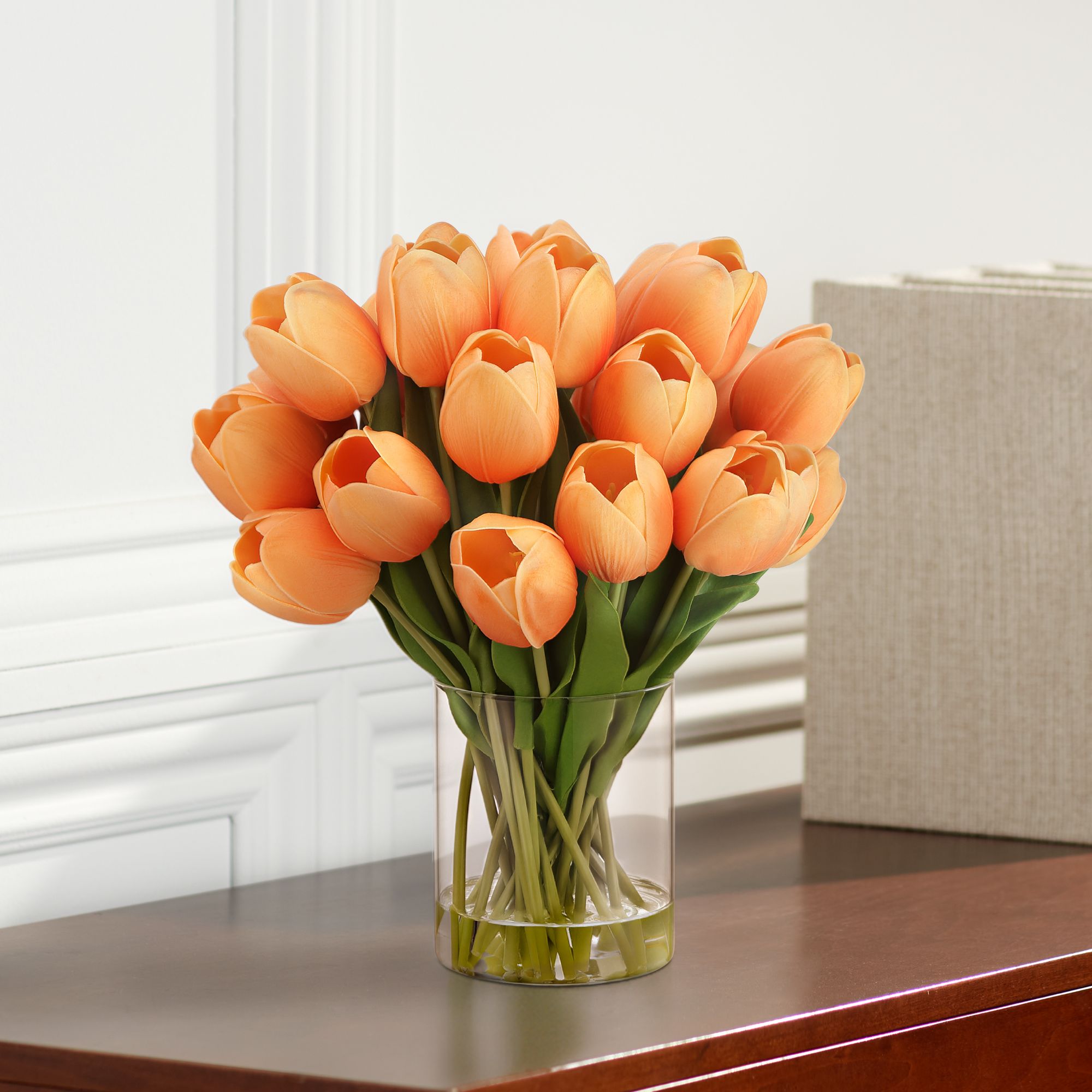Emmie Orange Tulips 12" High Faux Flower in Clear Glass Vase