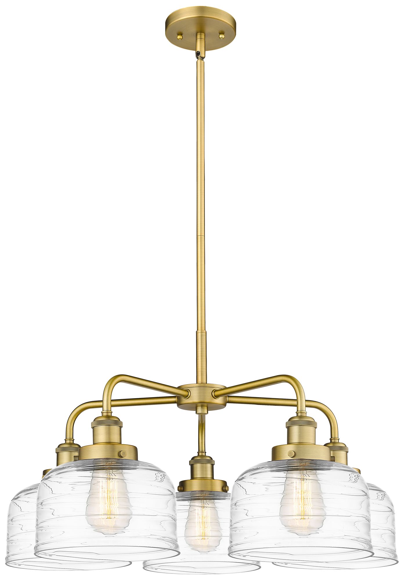 Bell 26"W 5 Light Brushed Brass Stem Hung Chandelier w/ Deco Swirl Sha