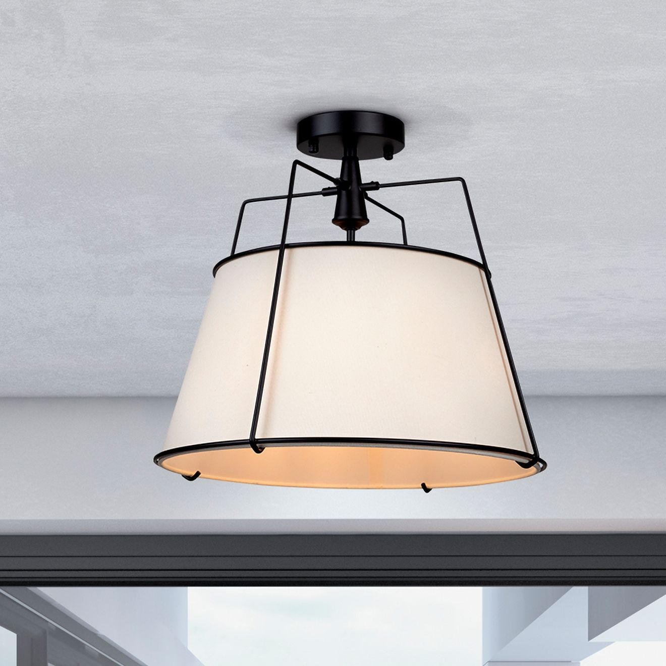 Pullman 17" Wide 3-Light Black Semi-Flush Mount With Cream Linen Shade