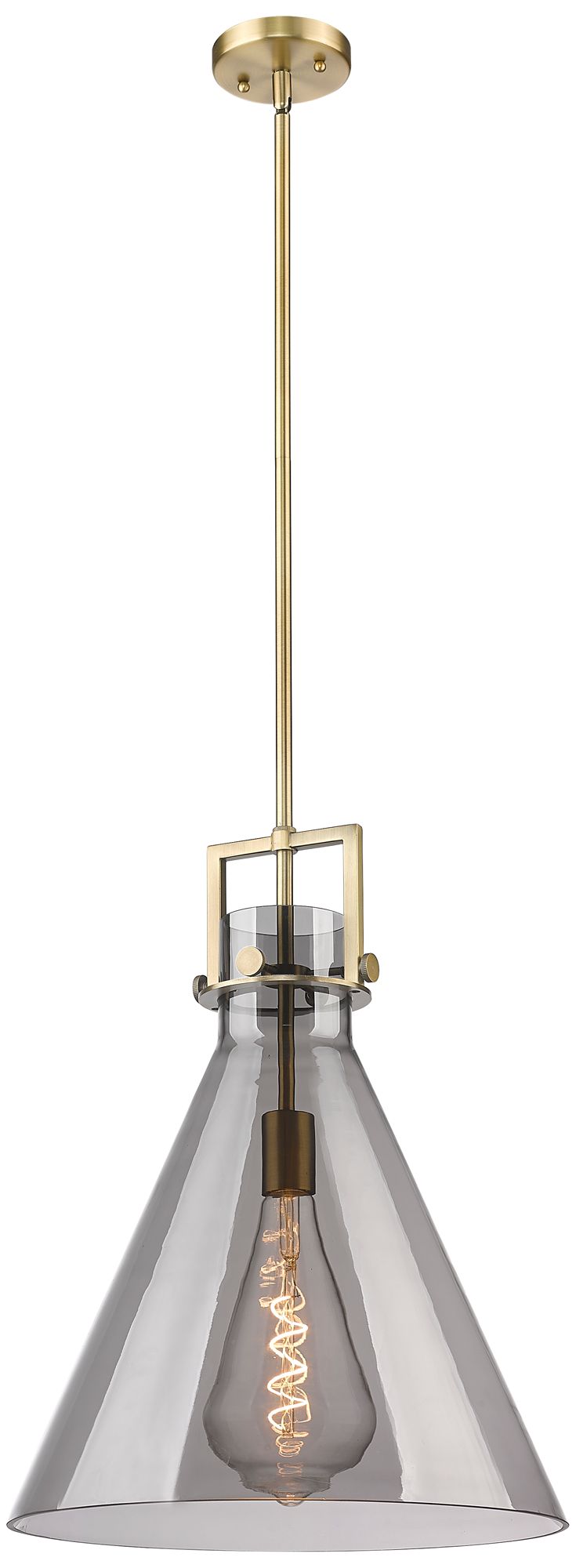 Newton Cone 16" Wide Stem Hung Brushed Brass Pendant With Smoke Shade