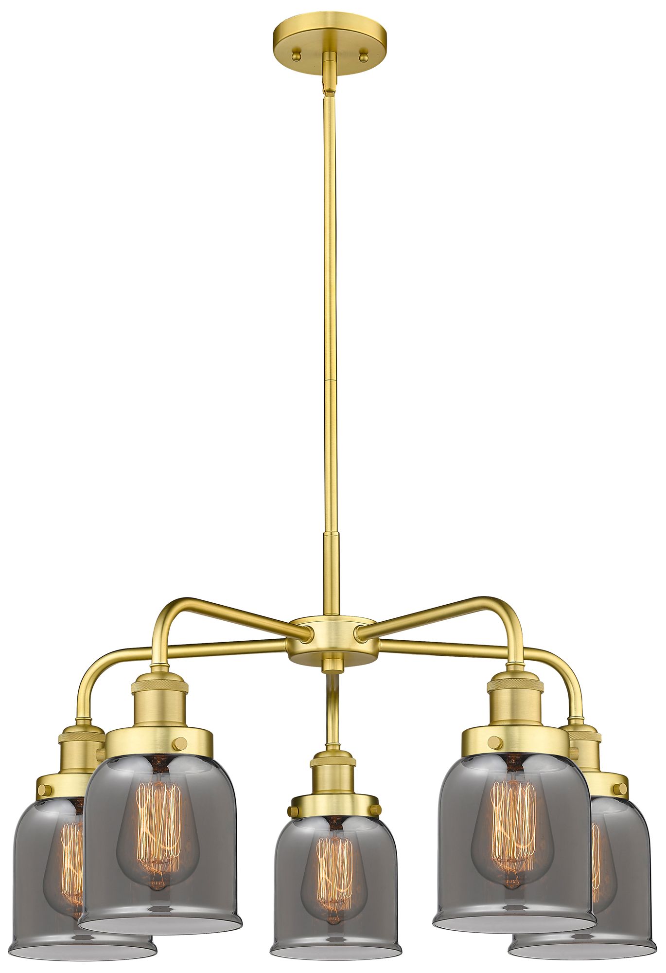 Bell 23"W 5 Light Satin Gold Stem Hung Chandelier w/ Smoke Glass Shade