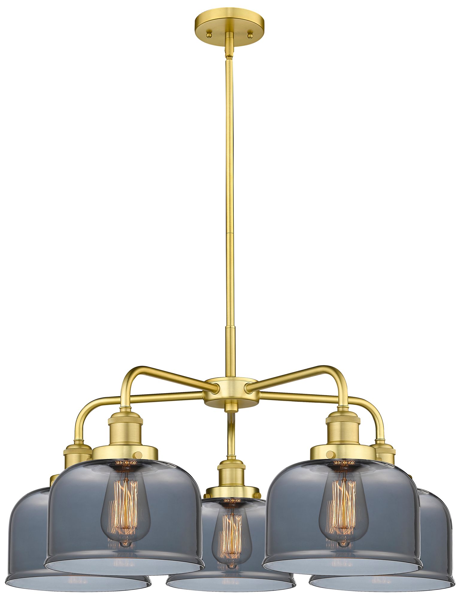 Bell 26"W 5 Light Satin Gold Stem Hung Chandelier w/ Smoke Glass Shade