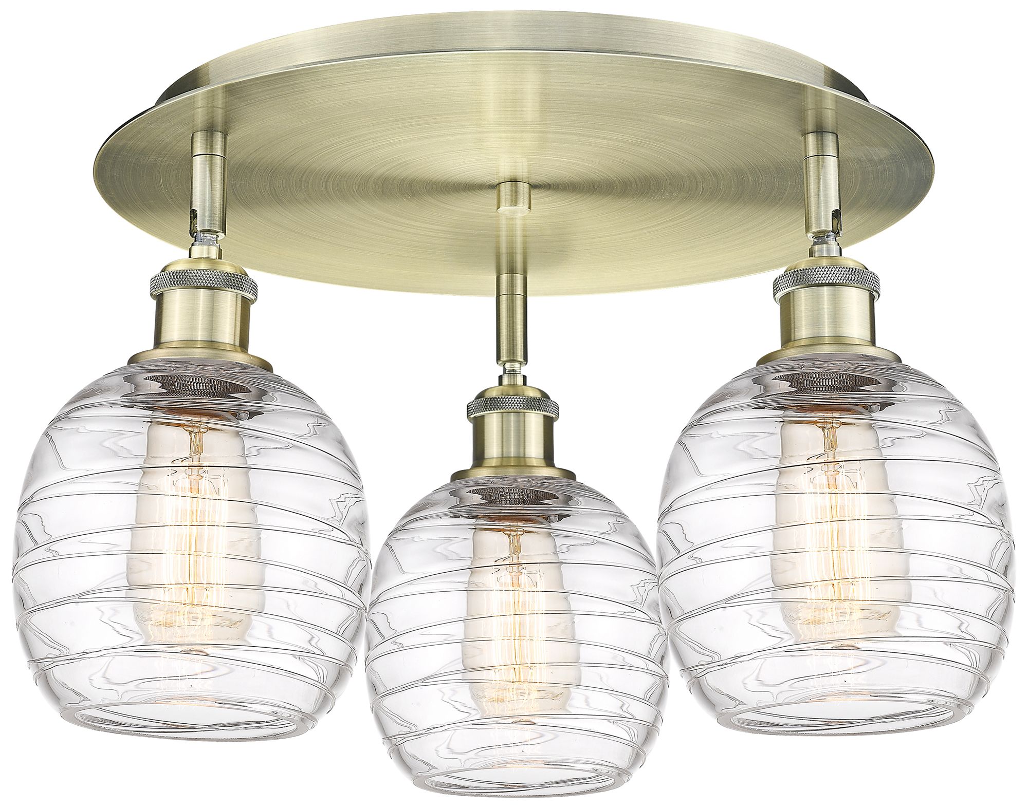 Belfast 17.75"W 3 Light Antique Brass Flush Mount w/ Deco Swirl Glass
