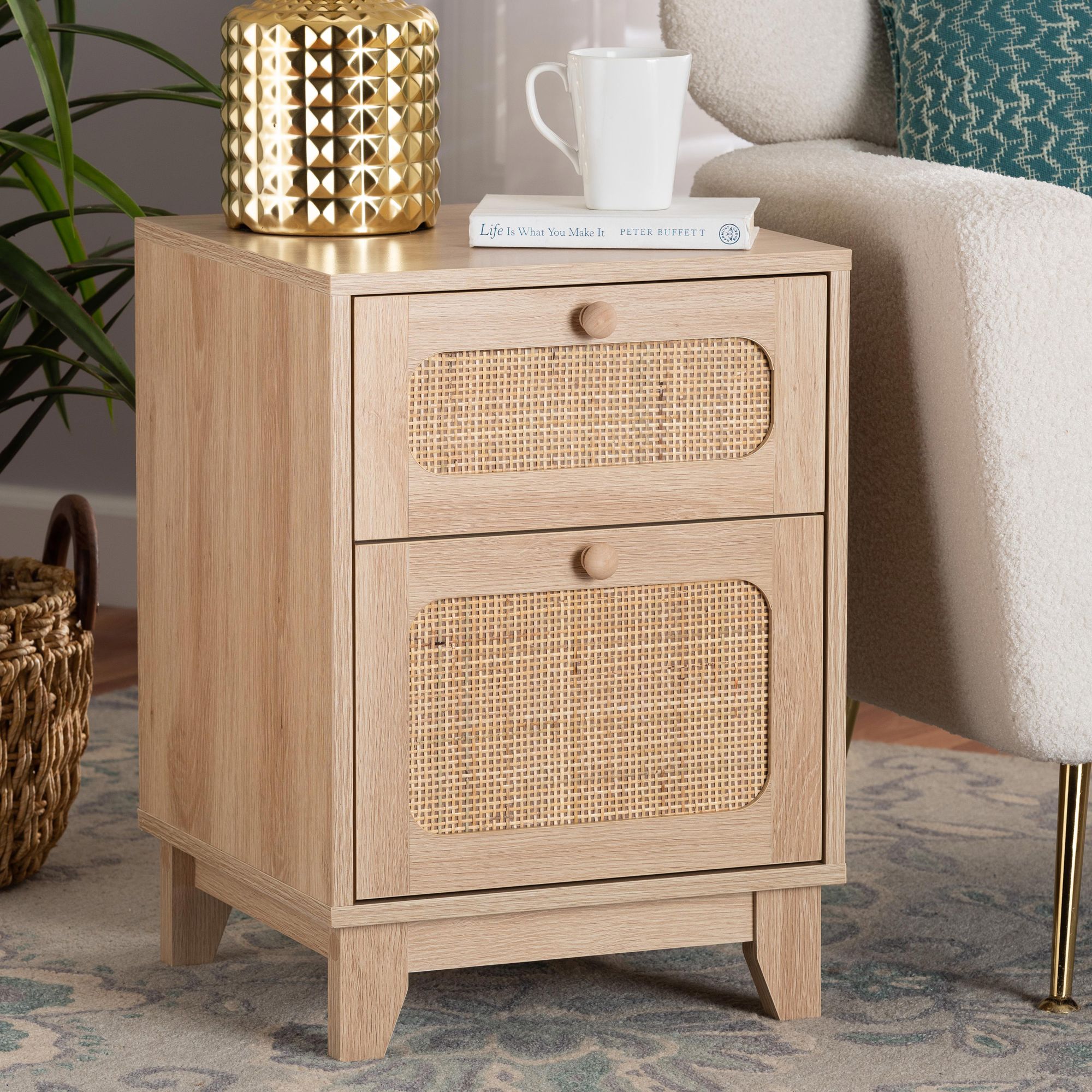 Elsbeth 15 3/4"W Brown Wood Rattan 1-Drawer 1-Door End Table