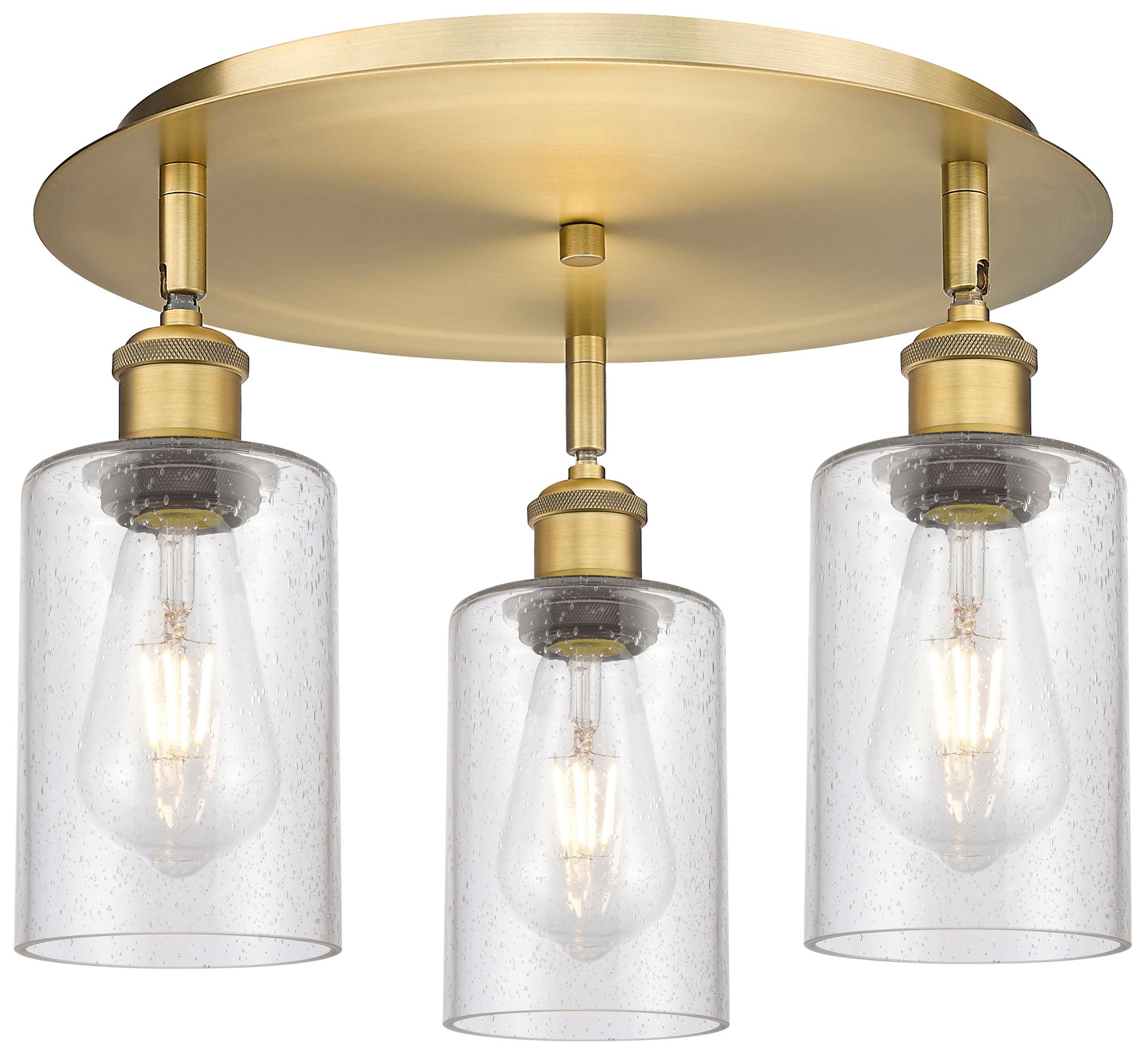Clymer 15.63" Wide 3 Light Brushed Brass Flush Mount With Seedy Glass