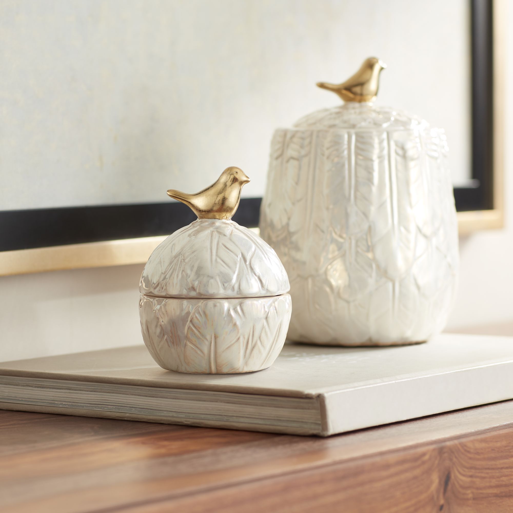 4 1/2" Spar Shiny Pearlized White Decorative Jar with Gold Lid