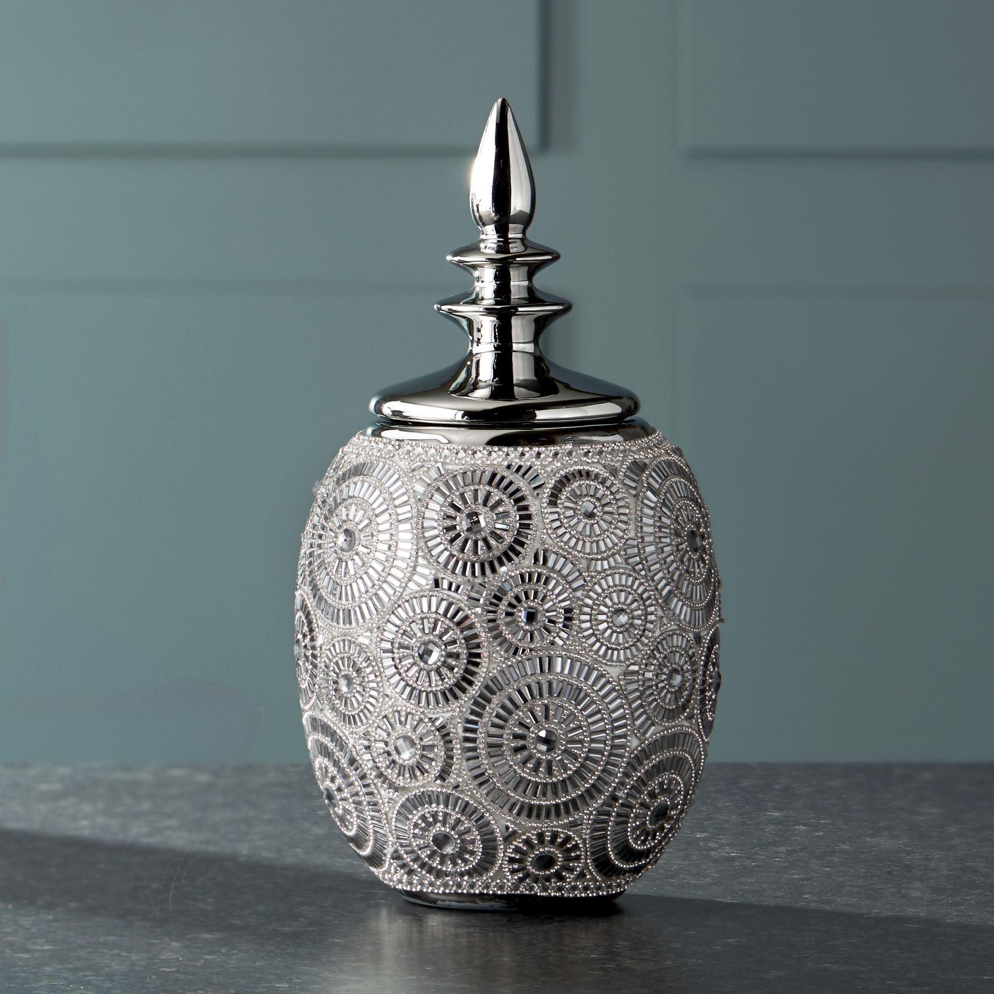 Silver Geometric Circles 13" High Ceramic Decorative Jar with Lid