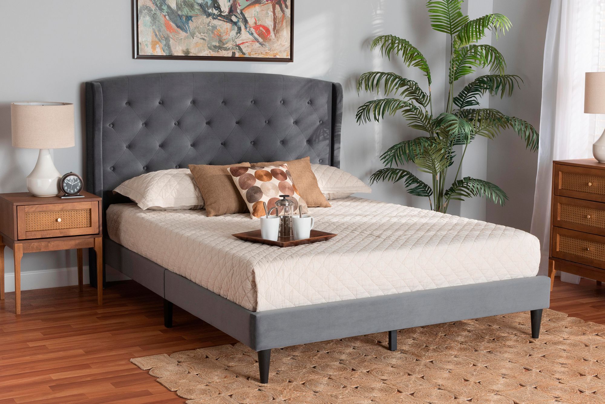 Joanna Gray Velvet Fabric Tufted Queen Platform Bed