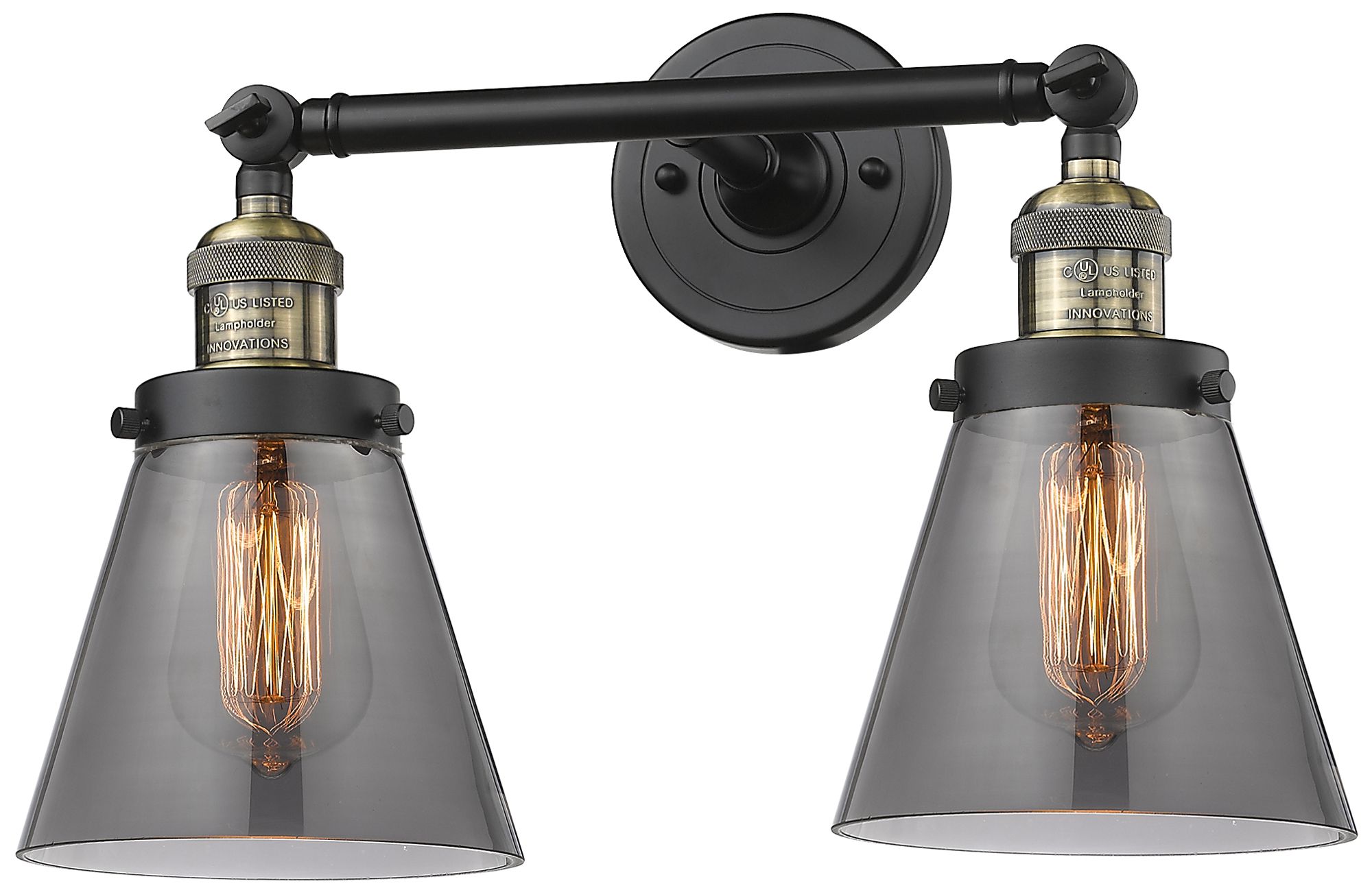 Small Cone 16" 2-Light Black Brass Tiltable Bath Light w/ Smoke Shade