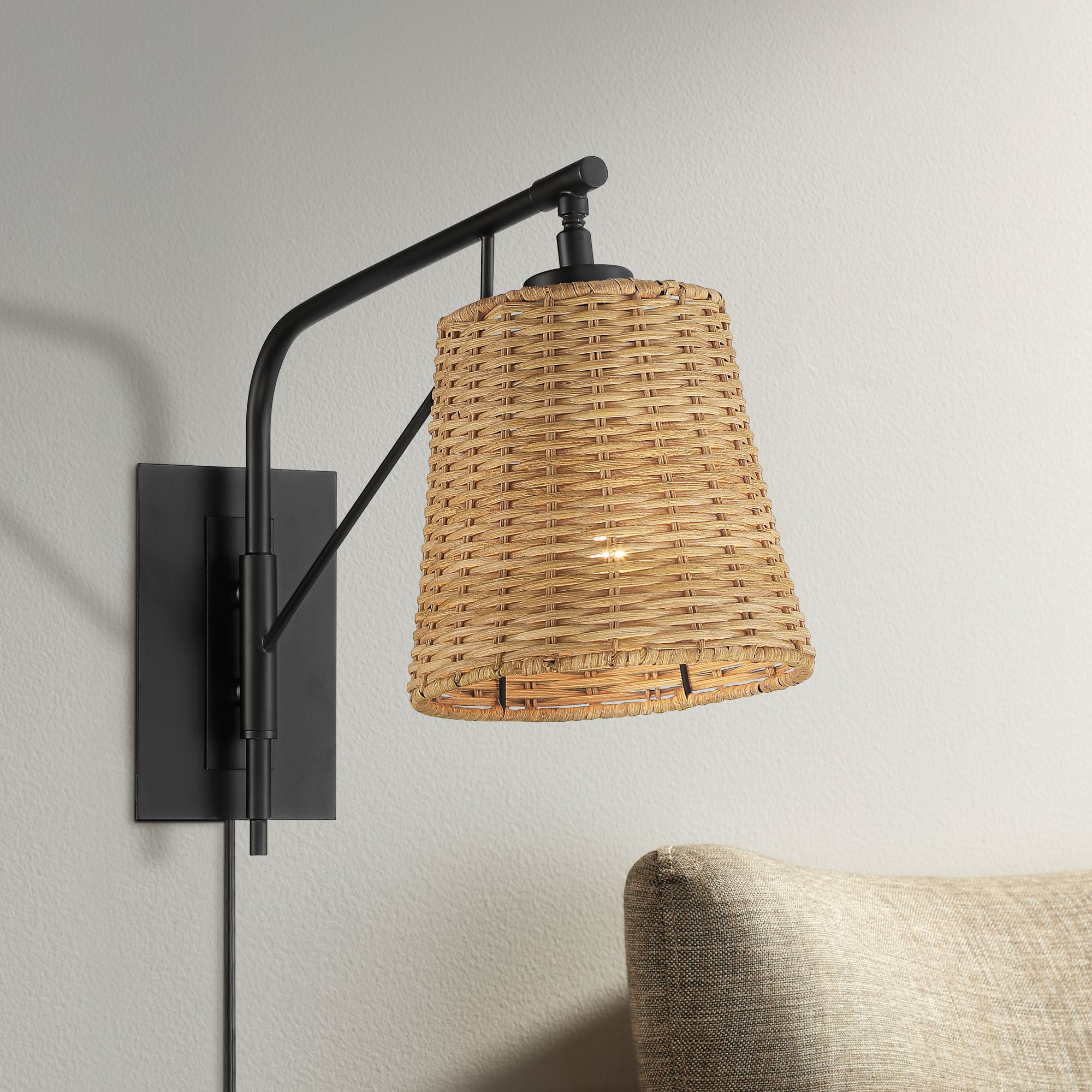 Franklin Iron Works Matteo 13" High Black and Rattan Plug-In Wall Lamp
