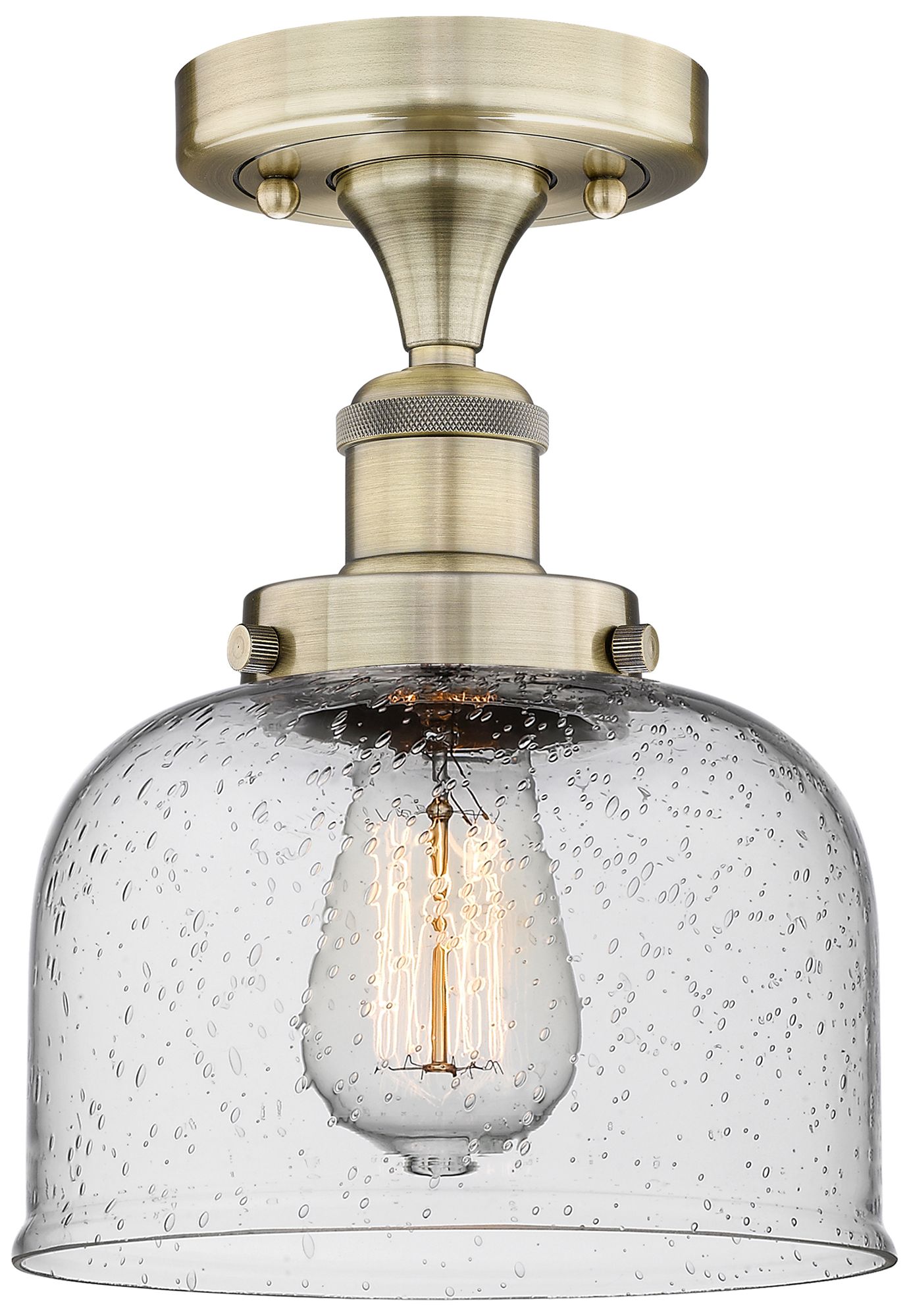 Bell 7.75" Wide Antique Brass Semi.Flush Mount With Seedy Glass Shade