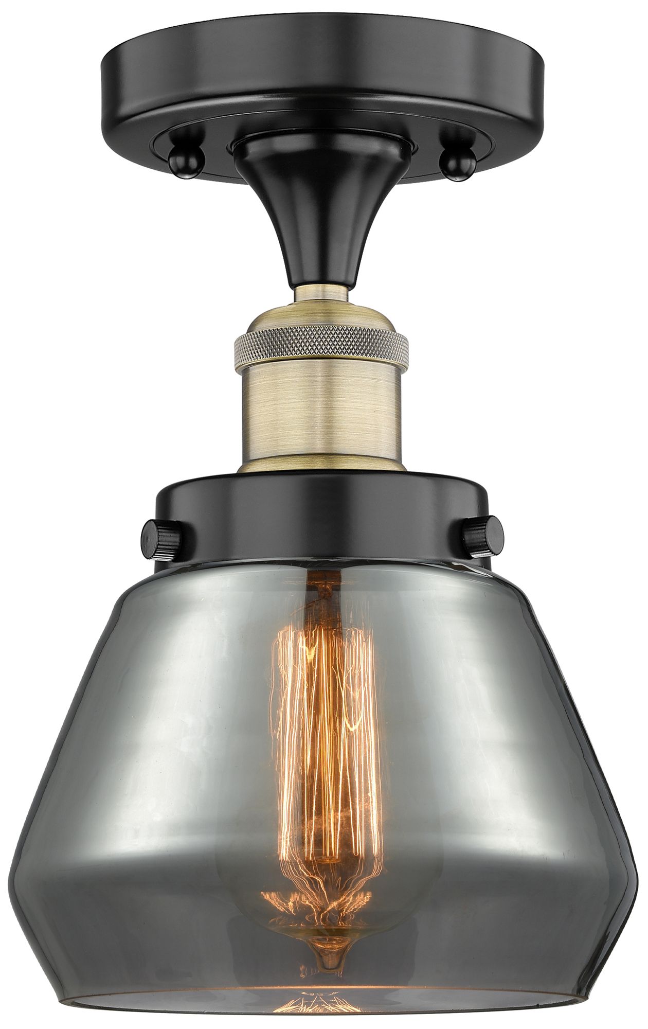 Fulton 6.5"W Black Antique Brass Semi.Flush Mount w/ Smoke Glass Shade