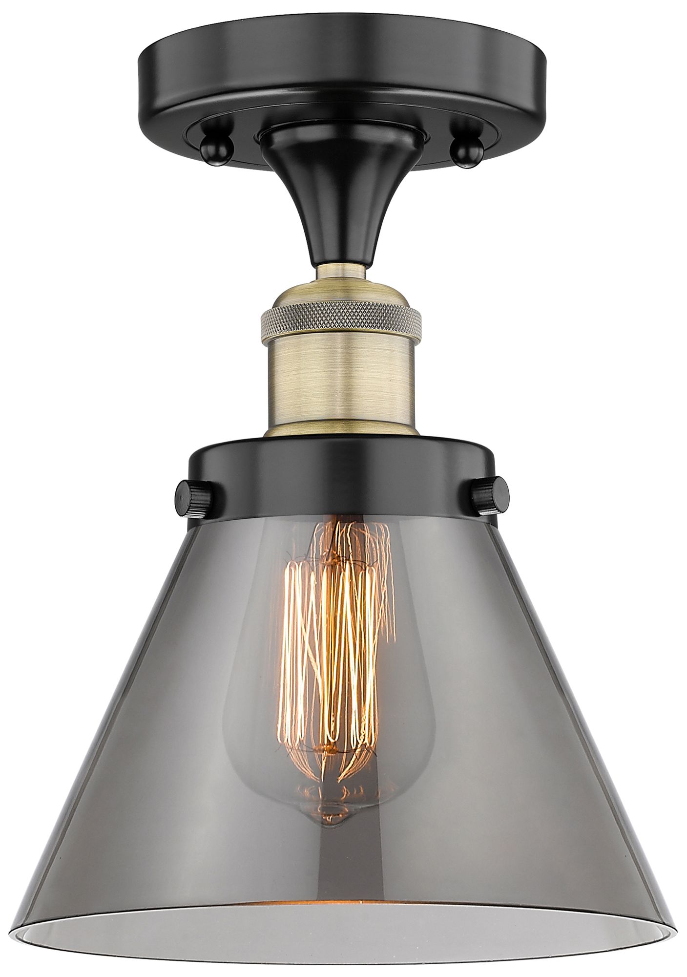 Cone 7.75"W Black Antique Brass Semi.Flush Mount w/ Smoke Glass Shade