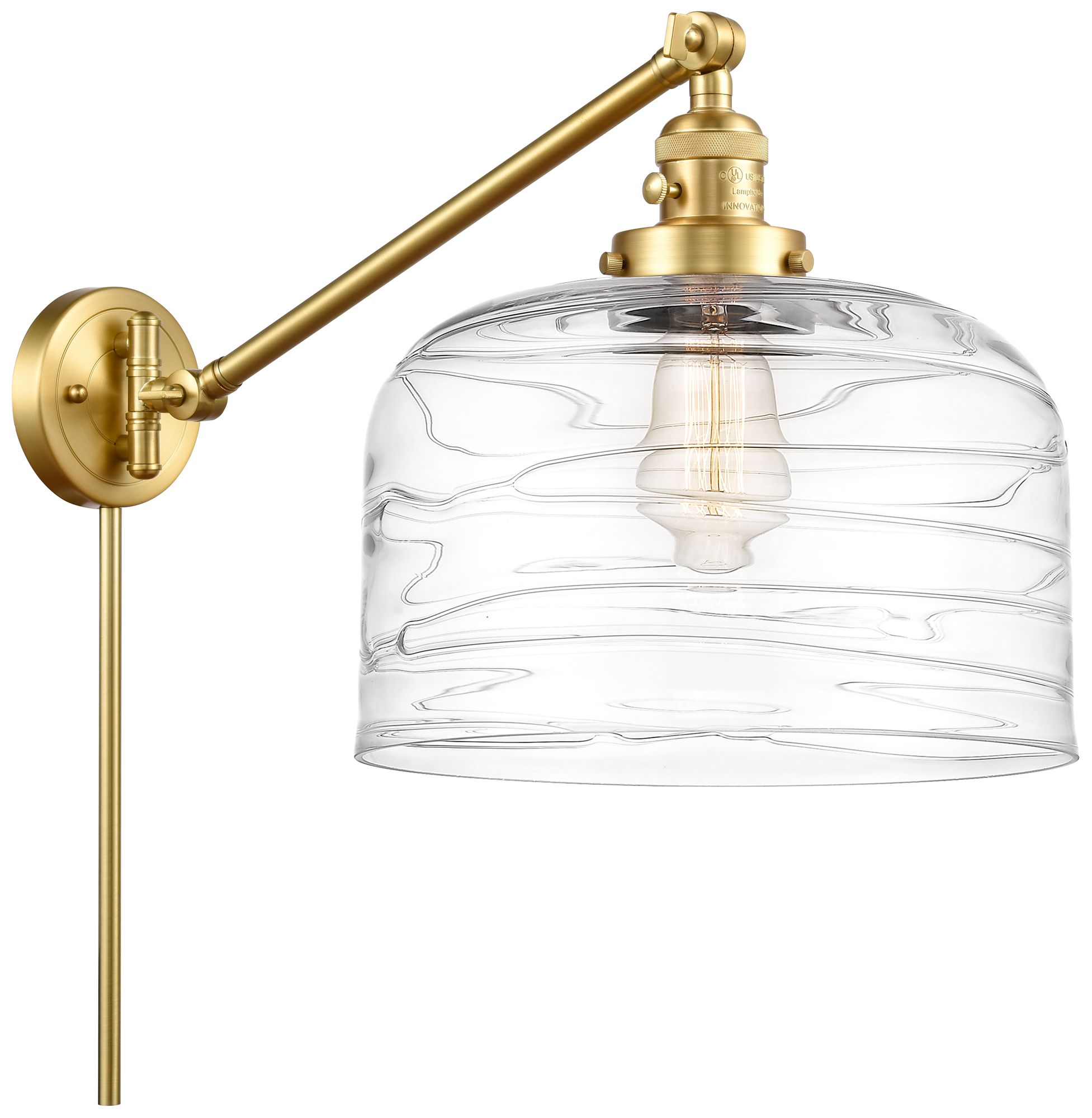 Bell 12" Satin Gold Swing Arm With Clear Deco Swirl Shade