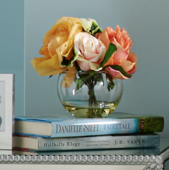 Yellow and Pink 7 1/2" Wide Roses in Clear Glass Pot