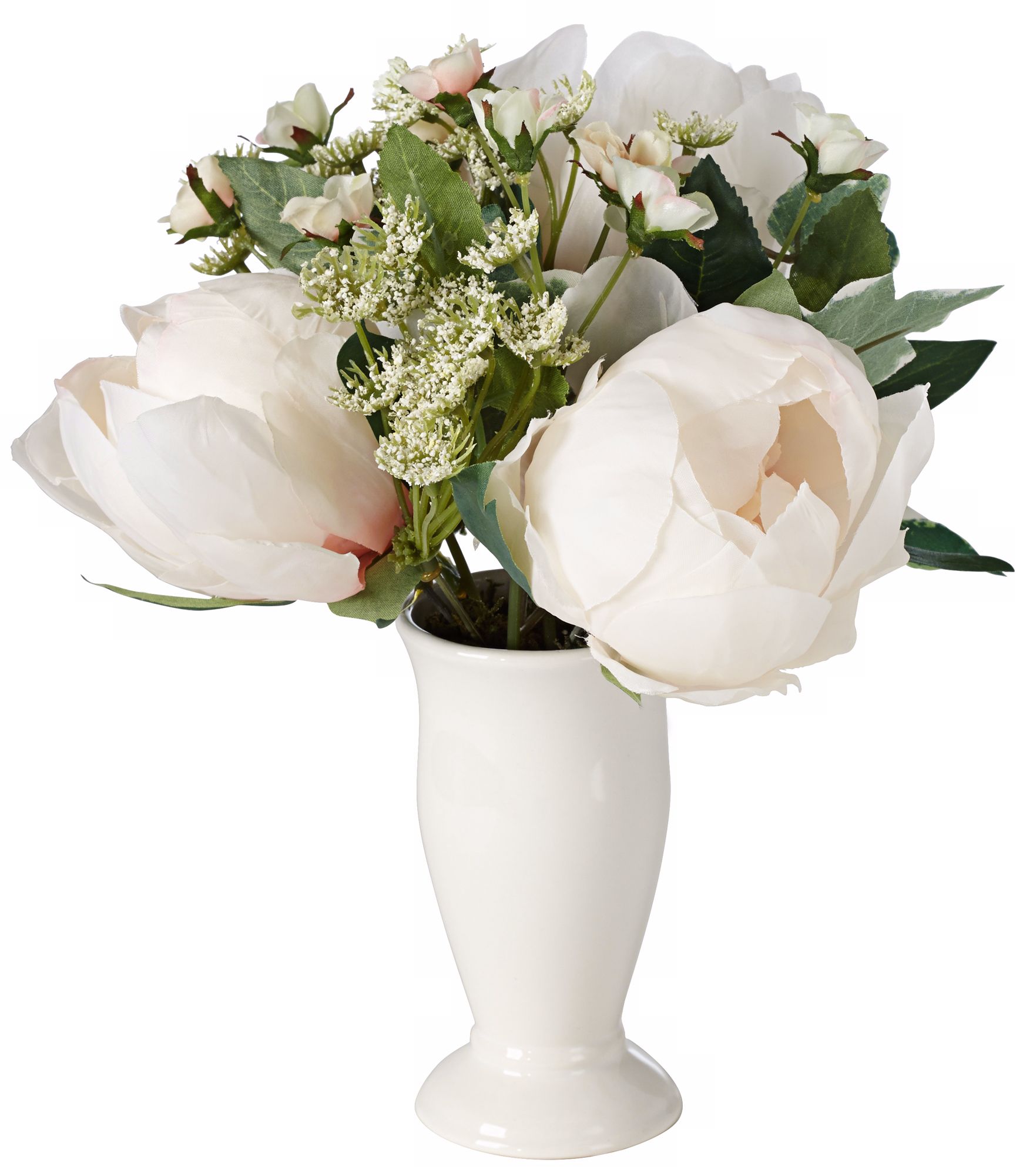 Peony and Rose 9 1/2" High Flowers in White Ceramic Pot