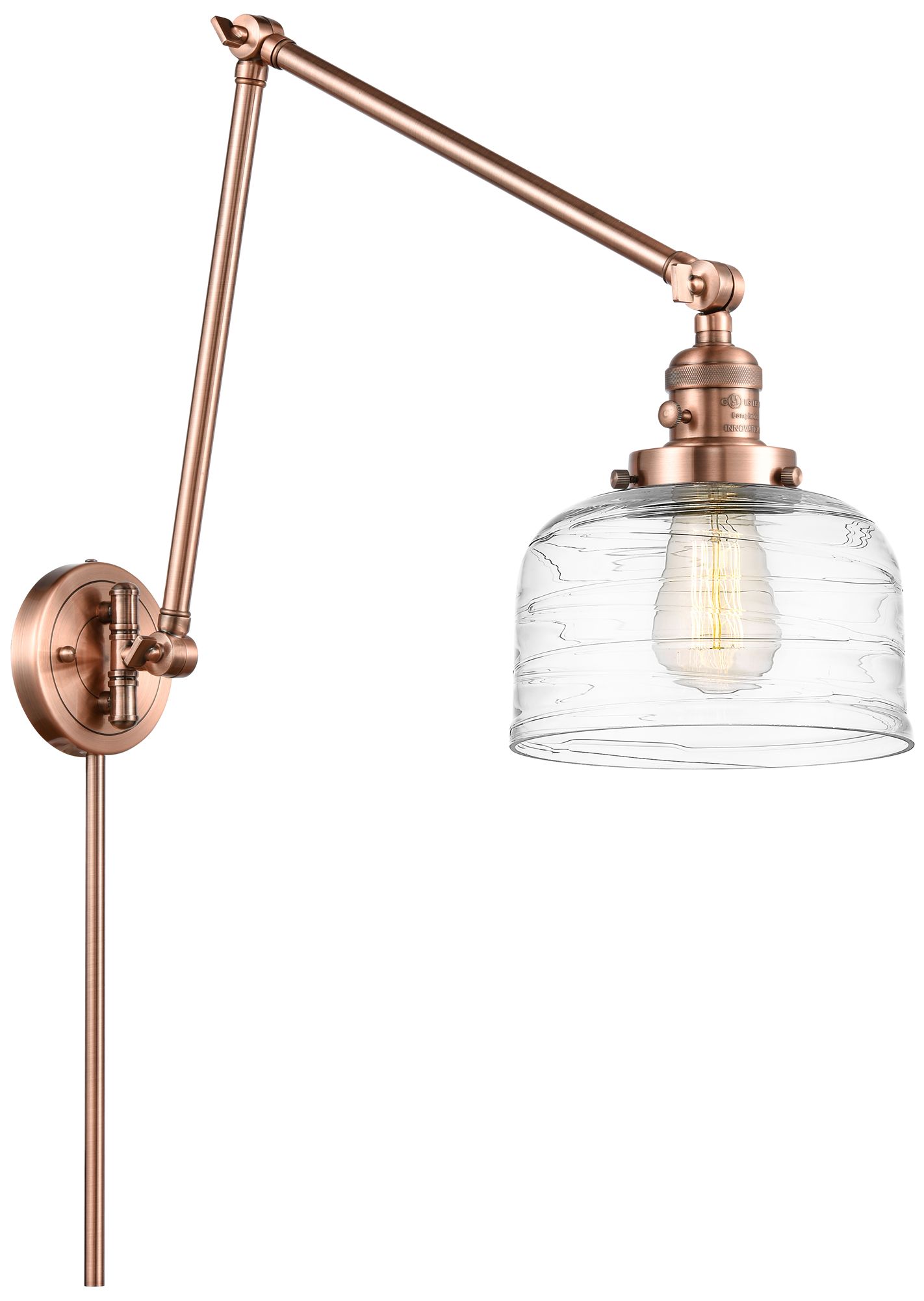 Bell 8" Antique Copper LED Double Swing Arm With Clear Deco Swirl Shad