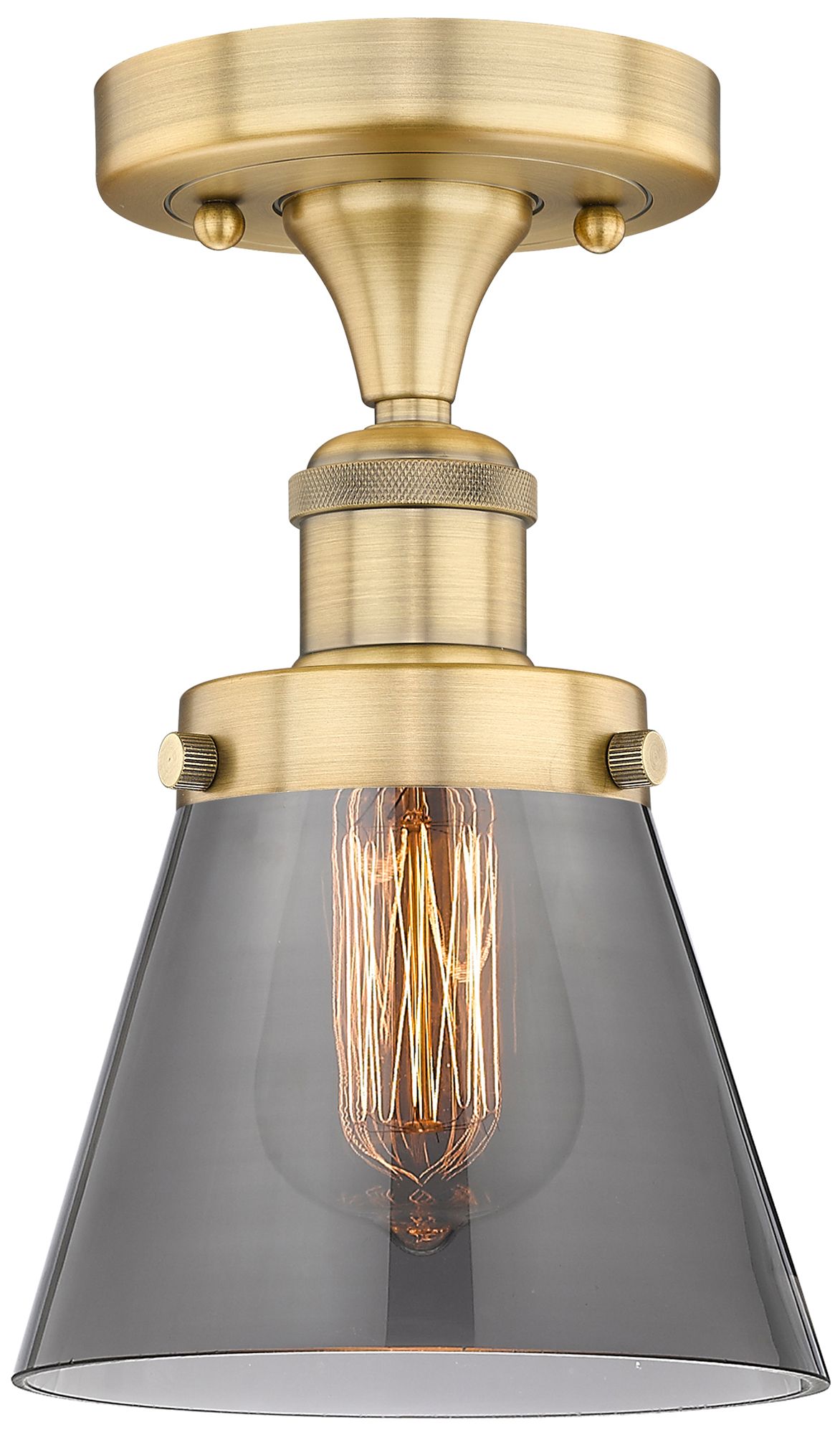 Cone 6.25"W Brushed Brass Semi.Flush Mount With Plated Smoke Glass Sha