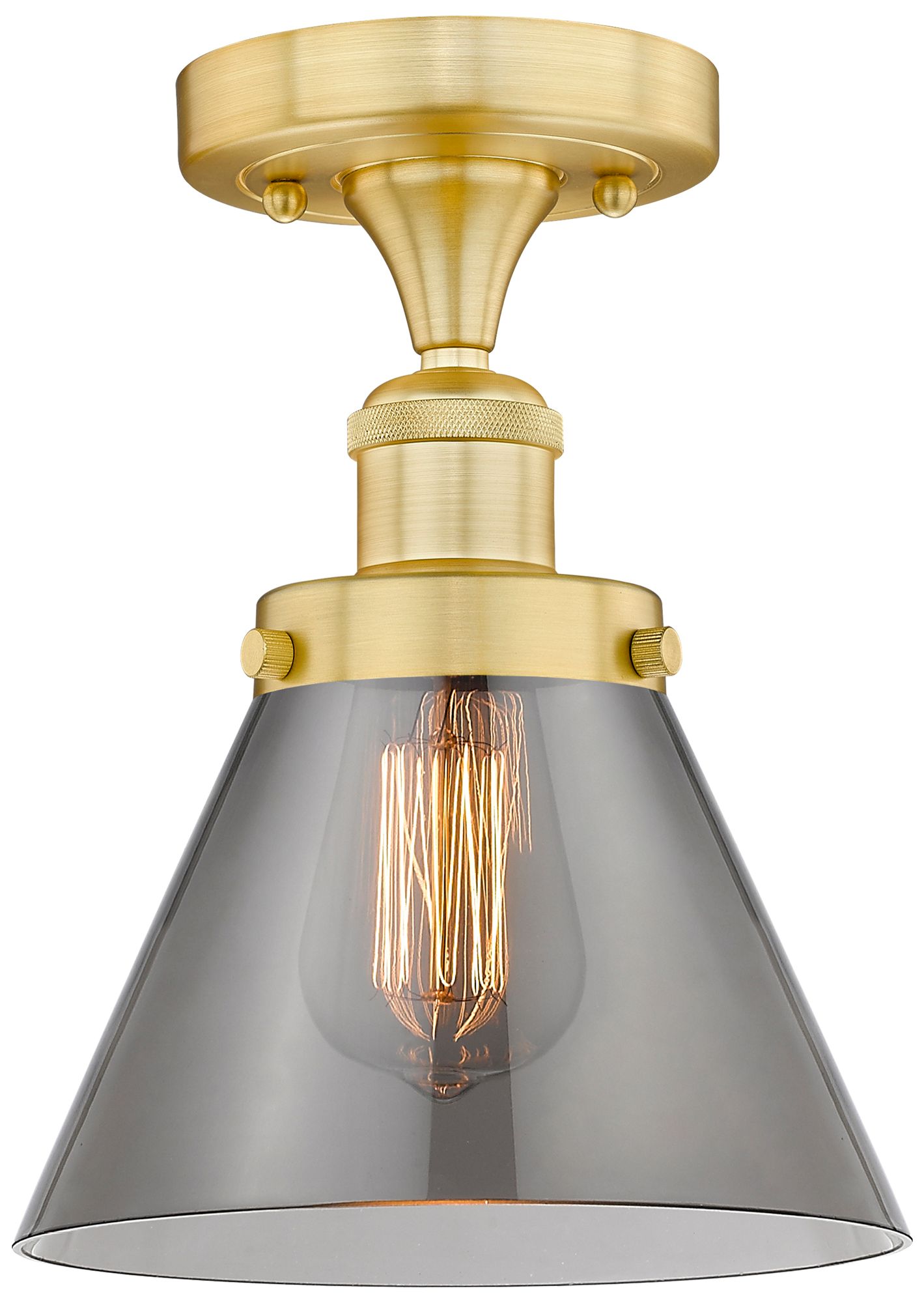 Cone 7.75" Wide Satin Gold Semi.Flush Mount With Plated Smoke Glass Sh