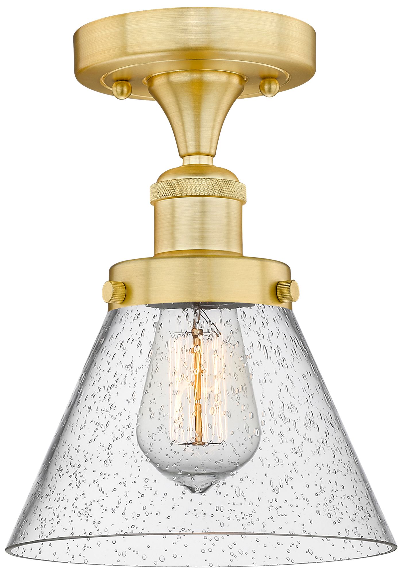 Cone 7.75" Wide Satin Gold Semi.Flush Mount With Seedy Glass Shade