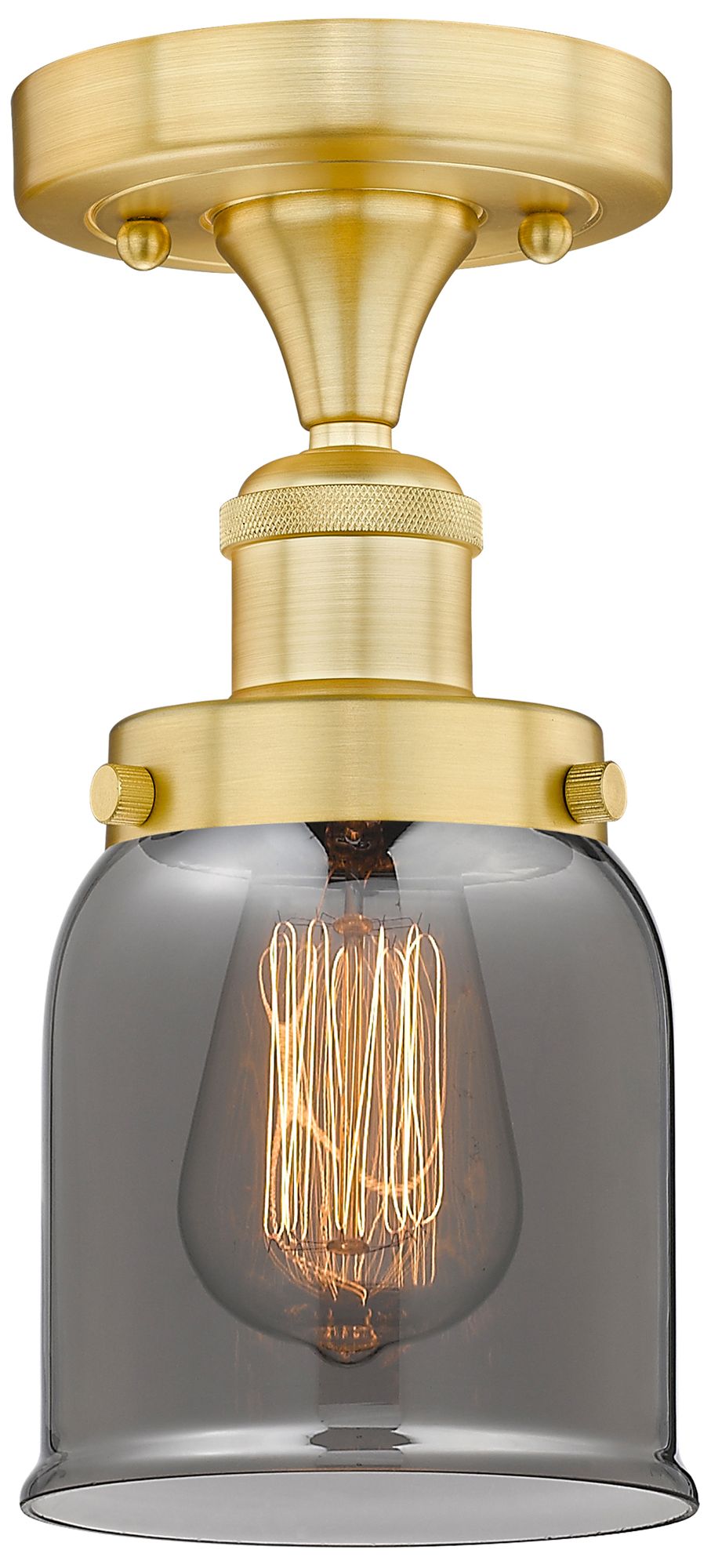 Bell 5" Wide Satin Gold Semi.Flush Mount With Plated Smoke Glass Shade