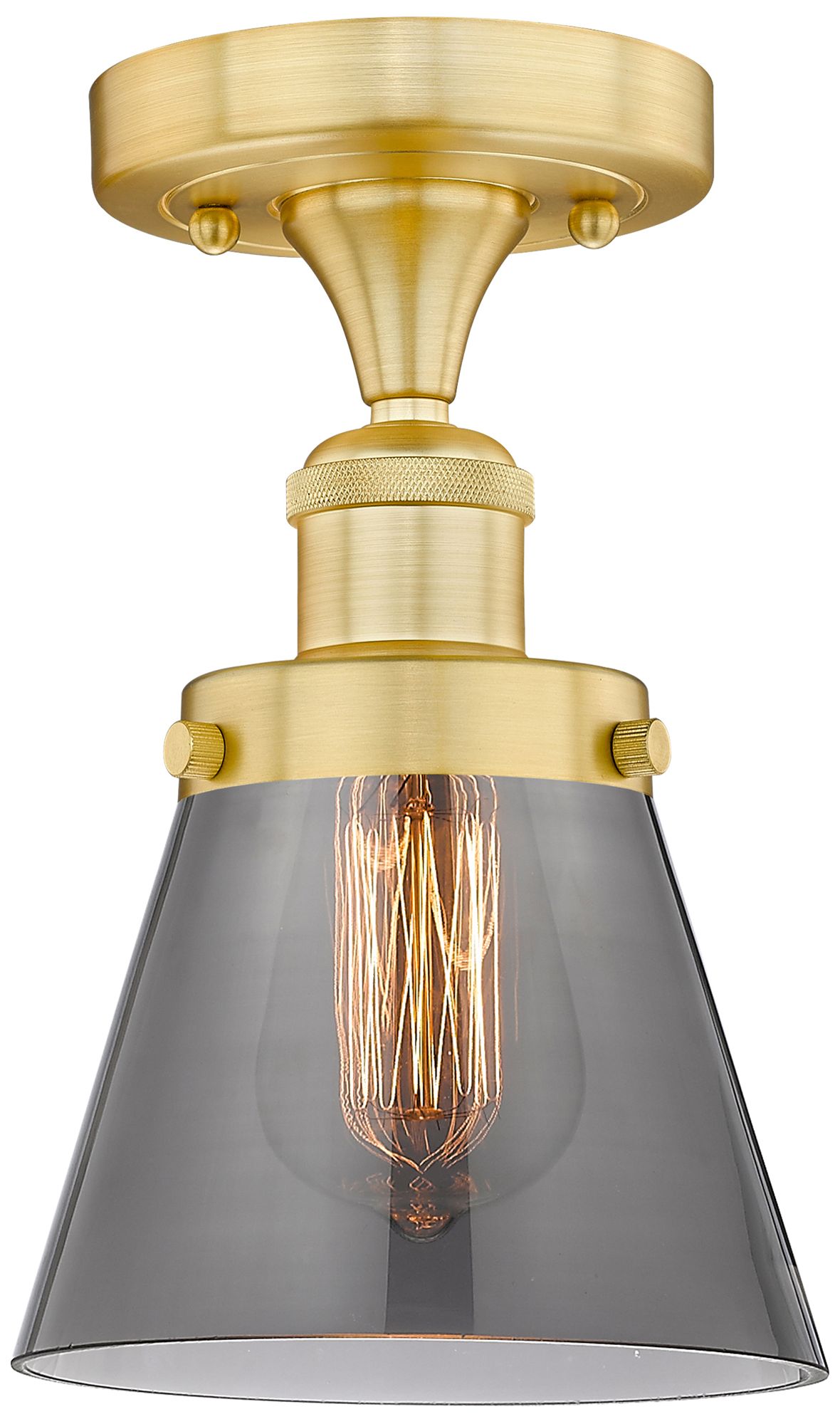 Cone 6.25" Wide Satin Gold Semi.Flush Mount With Plated Smoke Glass Sh