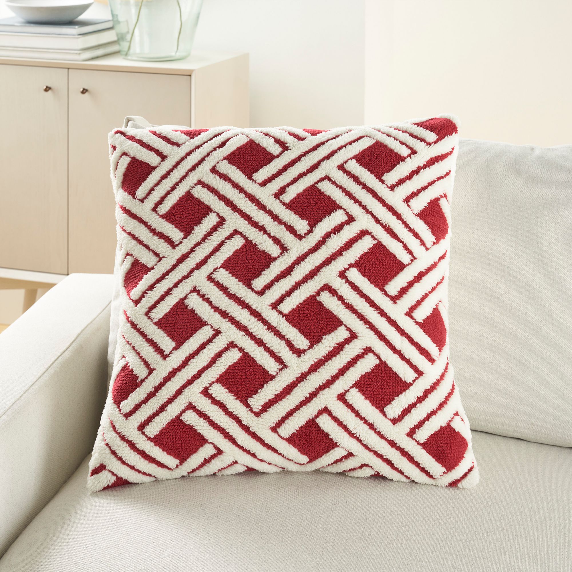 Faux Fur Red Jacquard Basketweave 20" Square Throw Pillow