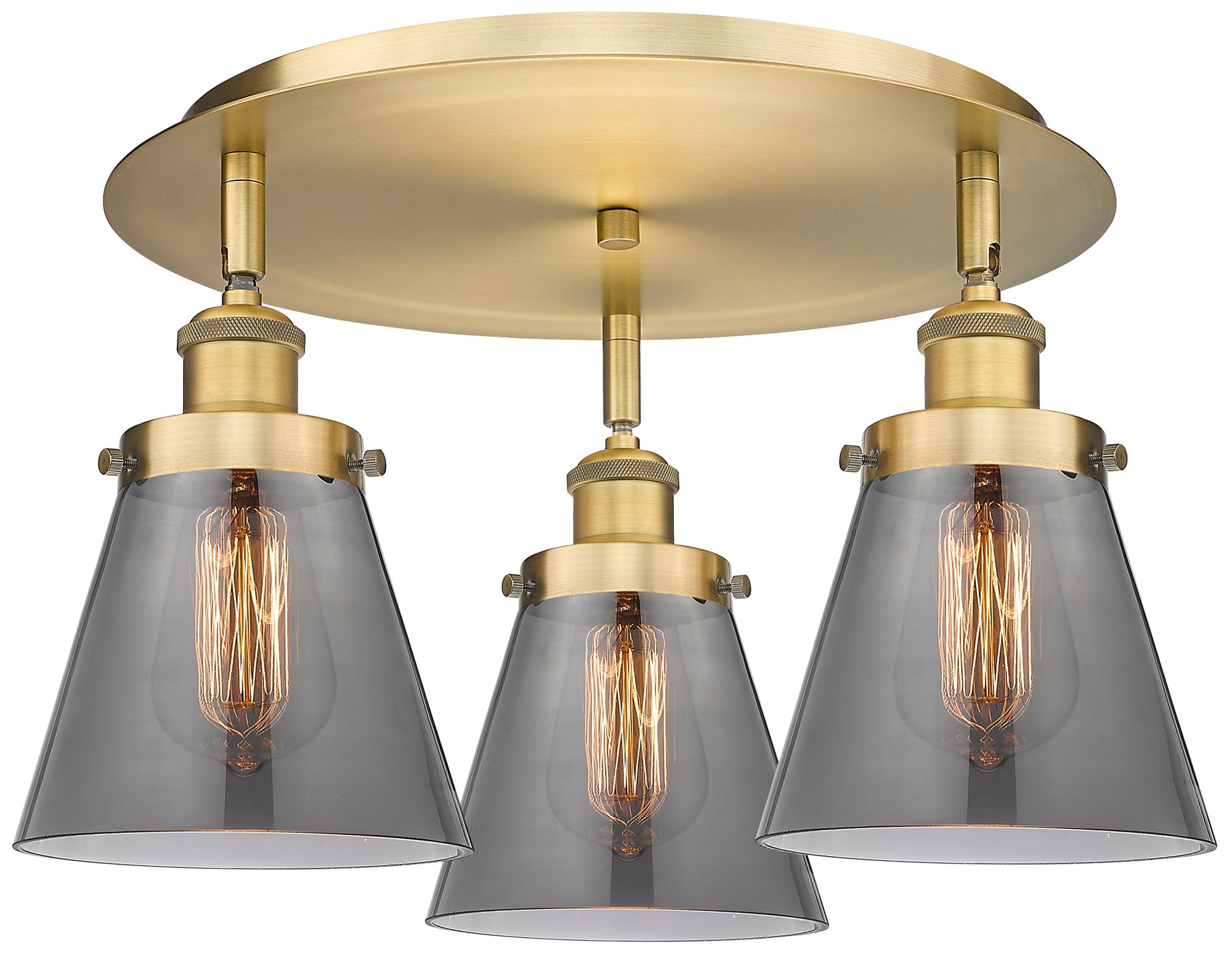 Cone 18"W 3 Light Brushed Brass Flush Mount With Plated Smoke Glass Sh