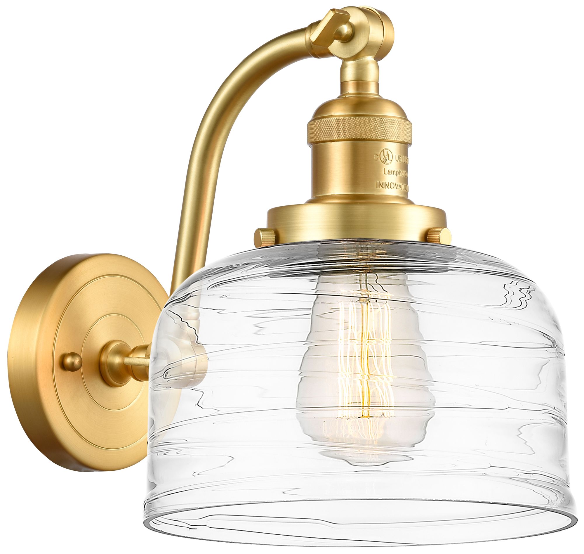 Bell 8" Satin Gold Sconce With Clear Deco Swirl Shade